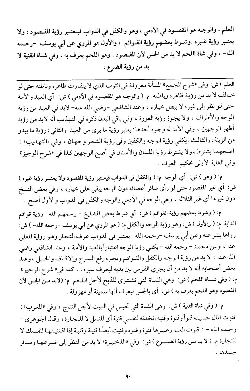 العلم، والوجه هو المقصود في الآدمي، وهو والكفل في الدواب فيعتبر رؤية المقصود، ولا يعتبر رؤية غيره. وشرط بعضهم رؤية القوائم. والأول هو المروي عن أبي يوسف - رَحِمَهُ اللَّهُ -، وفي شاة اللحم لا بد من الجس لأن المقصود وهو اللحم يعرف به، وفي شاة القنية لا بد من رؤية الضرع