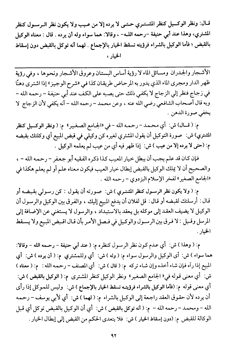 قال: ونظر الوكيل كنظر المشتري حتى لا يرده إلا من عيب ولا يكون نظر الرسول كنظر المشتري، وهذا عند أبي حنيفة - رَحِمَهُ اللَّهُ -، وقالا: هما سواء وله أن يرده. قال: معناه الوكيل بالقبض؛ فأما الوكيل بالشراء فرؤيته تسقط الخيار بالإجماع. لهما أنه توكل بالقبض دون إسقاط الخيار