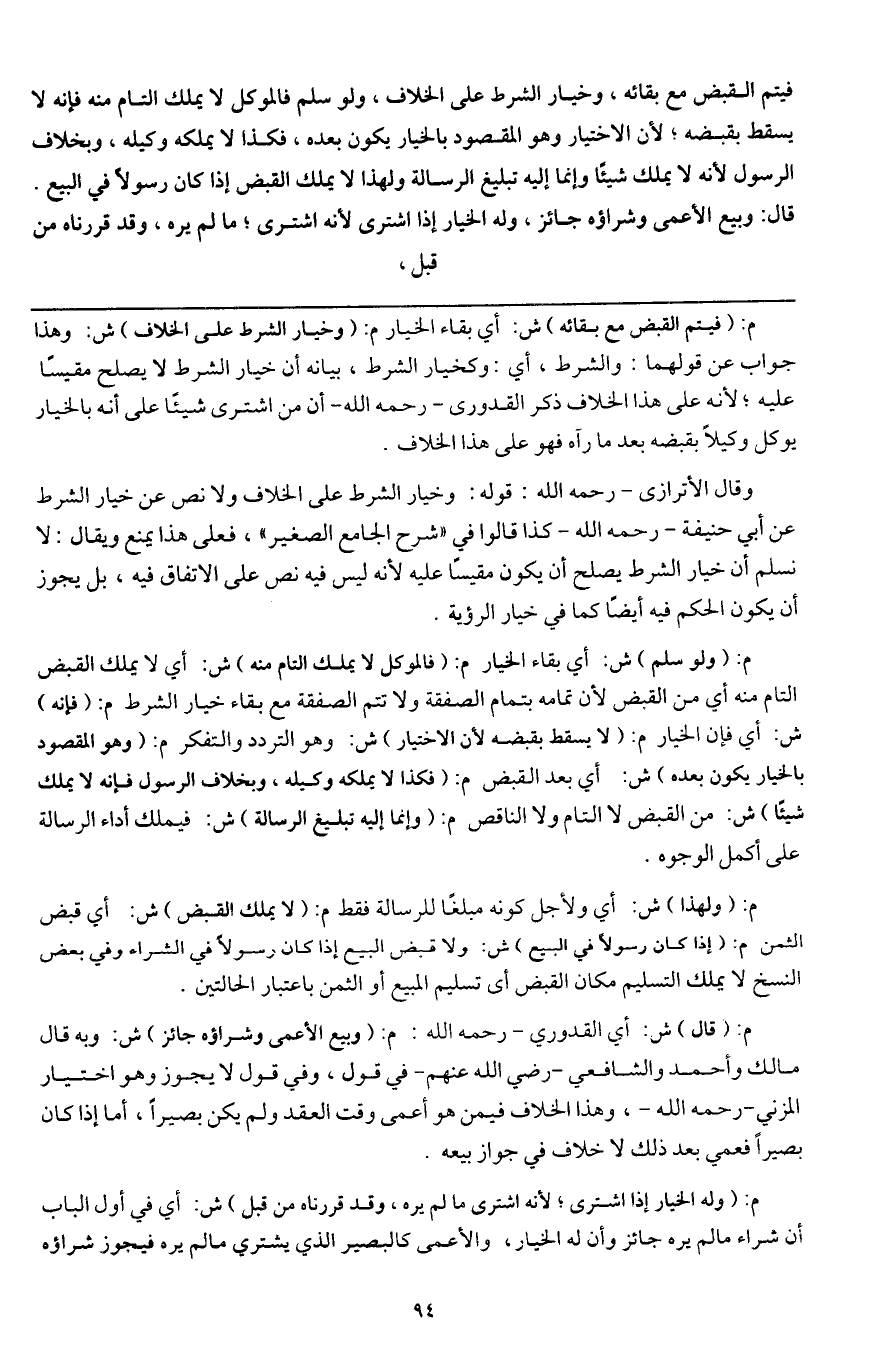 ـــــــــــــــــــــــــــــQم: (فيتم القبض مع بقائه) ش: أي بقاء الخيار م: (وخيار الشرط على الخلاف) ش: وهذا جواب عن قولهما: والشرط، أي: وكخيار الشرط، بيانه أن خيار الشرط لا يصلح مقيسا عليه؛ لأنه على هذا الخلاف ذكر القدوري - رَحِمَهُ اللَّهُ - أن من اشترى شيئا على أنه بالخيار يوكل وكيلا بقبضه بعد ما رآه فهو على هذا الخلاف.
