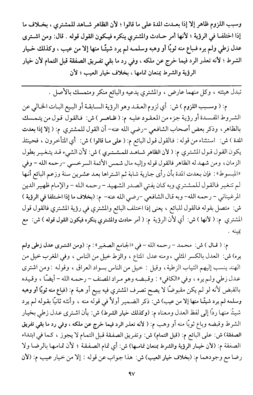 م: (قال) ش: محمد - رَحِمَهُ اللَّهُ - في " الجامع الصغير ": م: (ومن اشترى عدل زطي ولم يره) ش: العدل بالكسر المثلي، ومنه عدل المتاع، والزط خيل من الناس، وفي المغرب خيل من الهند ينسب إليهم الثياب الزطية، وقيل: خيل من الناس بسواد العراق، وقوله: ومن اشترى عدل زطي ولم يره، وفي " الكافي ": وقبضه وهو مراد المصنف - رَحِمَهُ اللَّهُ - أيضا، وقيده بالقبض؛ لأنه لو لم يكن مقبوضا لا يصح تصرف المشتري فيه ببيع أو هبة م: (فباع منه ثوبا أو وهبه وسلمه لم يرد شيئا منها إلا من عيب) ش: ذكر الضمير أولا في قوله منه، وأنثه ثانيا بقوله لم يرد شيئا منها ردا إلى لفظ العدل ومعناه م: (وكذلك خيار الشرط) ش: بأن اشترى عدل زطي بخيار الشرط وقبضه وباع ثوبا منه أو وهب م: (لأنه تعذر الرد فيما خرج عن ملكه، وفي رد ما بقي تفريق الصفقة) ش: على البائع م: (قبل التمام) ش: وتفريق الصفقة قبل التمام لا يجوز، كما في ابتداء الصفقة م: (لأن خيار الرؤية والشرط يمنعان تمامها) ش: أي تمام الصفقة؛ لأن تمامها بالرضا ولا رضا مع وجودهما م: (بخلاف خيار العيب) ش: هذا جواب عن قوله: إلا من خيار عيب م: (لأن