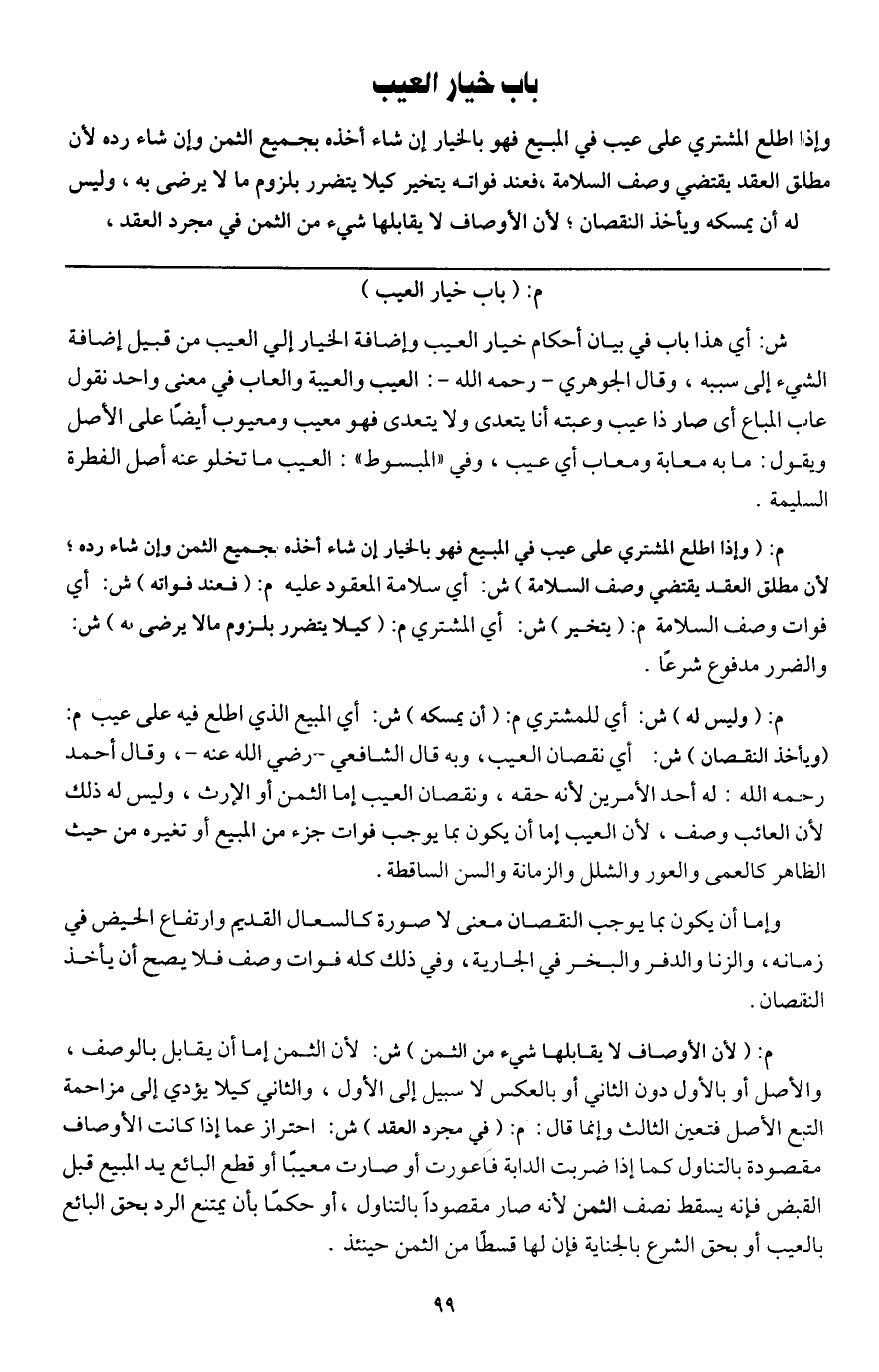 باب خيار العيب وإذا اطلع المشتري على عيب في المبيع فهو بالخيار إن شاء أخذه بجميع الثمن وإن شاء رده؛ لأن مطلق العقد يقتضي وصف السلامة، فعند فواته يتخير كيلا يتضرر بلزوم ما لا يرضى به، وليس له أن يمسكه ويأخذ النقصان؛ لأن الأوصاف لا يقابلها شيء من الثمن في مجرد العقد