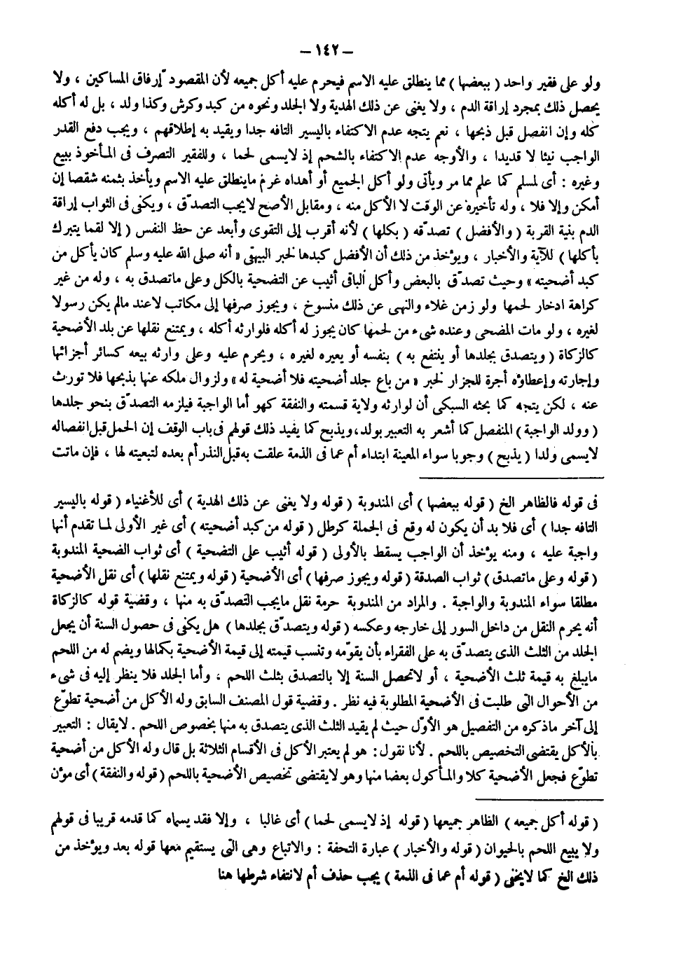 وَلَوْ عَلَى فَقِيرٍ وَاحِدٍ (بِبَعْضِهَا) مِمَّا يَنْطَلِقُ عَلَيْهِ الِاسْمُ فَيَحْرُمُ عَلَيْهِ أَكْلُ جَمِيعِهِ لِأَنَّ الْمَقْصُودَ إرْفَاقُ الْمَسَاكِينِ، وَلَا يَحْصُلُ ذَلِكَ بِمُجَرَّدِ إرَاقَةِ الدَّمِ، وَلَا يُغْنِي عَنْ ذَلِكَ الْهَدِيَّةُ وَلَا الْجِلْدُ وَنَحْوُهُ مِنْ كَبِدٍ وَكَرِشٍ وَكَذَا وَلَدٌ، بَلْ لَهُ أَكْلُهُ كُلِّهِ وَإِنْ انْفَصَلَ قَبْلَ ذَبْحِهَا، نَعَمْ يُتَّجَهُ عَدَمُ الِاكْتِفَاءِ بِالْيَسِيرِ التَّافِهِ جِدًّا وَيُقَيَّدُ بِهِ إطْلَاقُهُمْ، وَيَجِبُ دَفْعُ الْقَدْرِ الْوَاجِبِ نِيئًا لَا قَدِيدًا، وَالْأَوْجَهُ عَدَمُ الِاكْتِفَاءِ بِالشَّحْمِ إذْ لَا يُسَمَّى لَحْمًا، وَلِلْفَقِيرِ التَّصَرُّفُ فِي الْمَأْخُوذِ بِبَيْعٍ وَغَيْرِهِ: أَيْ لِمُسْلِمٍ كَمَا عُلِمَ مِمَّا مَرَّ وَيَأْتِي وَلَوْ أَكَلَ الْجَمِيعَ أَوْ أَهْدَاهُ غَرِمَ مَا يَنْطَلِقُ عَلَيْهِ الِاسْمُ وَيَأْخُذُ بِثَمَنِهِ شِقْصًا إنْ أَمْكَنَ وَإِلَّا فَلَا، وَلَهُ تَأْخِيرُهُ عَنْ الْوَقْتِ لَا الْأَكْلُ مِنْهُ.