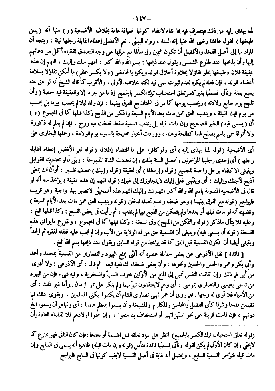 نَعَمْ الْأَفْضَلُ إعْطَاءُ الْقَابِلَةِ رِجْلَهَا نِيئَةً، وَيُتَّجَهُ أَنَّ الْمُرَادَ بِهَا إلَى أَصْلِ الْفَخِذِ وَالْأَفْضَلُ أَنْ تَكُونَ الْيَمِينُ وَإِرْسَالُهَا مَعَ مَرَقِهَا عَلَى وَجْهِ التَّصَدُّقِ لِلْفُقَرَاءِ أَكْمَلُ مِنْ دُعَائِهِمْ إلَيْهَا وَأَنْ يَذْبَحَهَا عِنْدَ طُلُوعِ الشَّمْسِ وَيَقُولَ عِنْدَ ذَبْحِهَا: بِسْمِ اللَّهِ وَاَللَّهُ أَكْبَرُ، اللَّهُمَّ مِنْك وَإِلَيْك، اللَّهُمَّ إنَّ هَذِهِ عَقِيقَةُ فُلَانٍ وَطَبْخُهَا بِحُلْوٍ تَفَاؤُلًا بِحَلَاوَةِ أَخْلَاقِ الْوَلَدِ وَيُكْرَهُ بِالْحَامِضِ (وَلَا يُكْسَرُ عَظْمٌ) مَا أَمْكَنَ تَفَاؤُلًا بِسَلَامَةِ أَعْضَاءِ الْوَلَدِ، فَإِنْ فَعَلَهُ لَمْ يُكْرَهْ لِعَدَمِ ثُبُوتِ نَهْيٍ فِيهِ لَكِنَّهُ خِلَافُ الْأَوْلَى، وَالْأَقْرَبُ كَمَا قَالَهُ الشَّيْخُ أَنَّهُ لَوْ عَقَّ عَنْهُ بِسُبْعِ بَدَنَةٍ وَتَأْتِي قِسْمَتُهَا بِغَيْرِ كَسْرٍ تَعَلَّقَ اسْتِحْبَابُ تَرْكِ الْكَسْرِ بِالْجَمِيعِ إذْ مَا مِنْ جُزْءٍ إلَّا وَلِلْعَقِيقَةِ فِيهِ حِصَّةٌ (وَأَنْ تُذْبَحَ يَوْمَ سَابِعِ وِلَادَتِهِ) وَيُحْسَبُ يَوْمُهَا كَمَا مَرَّ فِي الْخِتَانِ مَعَ الْفَرْقِ بَيْنَهُمَا، فَإِنْ وُلِدَ لَيْلًا لَمْ يُحْسَبْ يَوْمًا بَلْ يُحْسَبُ مِنْ يَوْمِ تِلْكَ اللَّيْلَةِ، وَيُنْدَبُ الْعَقُّ عَمَّنْ مَاتَ بَعْدَ الْأَيَّامِ السَّبْعَةِ وَالتَّمَكُّنِ مِنْ الذَّبْحِ وَكَذَا قَبْلَهَا كَمَا فِي الْمَجْمُوعِ (وَ)