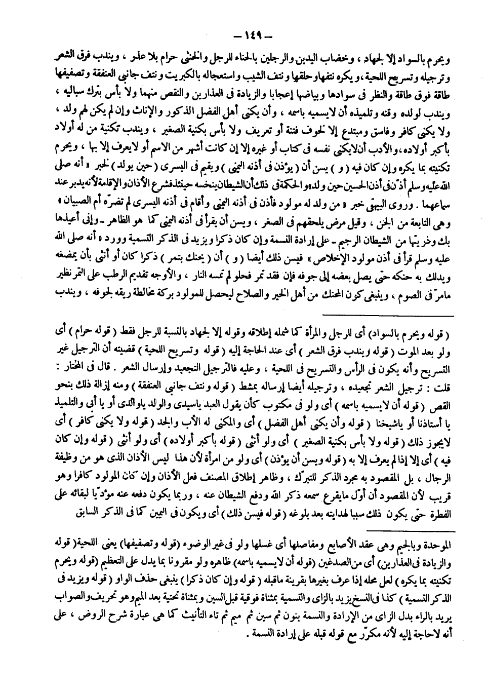 وَيَحْرُمُ بِالسَّوَادِ إلَّا لِجِهَادٍ، وَخِضَابُ الْيَدَيْنِ وَالرِّجْلَيْنِ بِالْحِنَّاءِ لِلرَّجُلِ وَالْخُنْثَى حَرَامٌ بِلَا عُذْرٍ، وَيُنْدَبُ فَرْقُ الشَّعْرِ وَتَرْجِيلُهُ وَتَسْرِيحُ اللِّحْيَةِ، وَيُكْرَهُ نَتْفُهَا وَحَلْقُهَا وَنَتْفُ الشَّيْبِ وَاسْتِعْجَالُهُ بِالْكِبْرِيتِ وَنَتْفُ جَانِبَيْ الْعَنْفَقَةِ وَتَصْفِيفُهَا طَاقَةً فَوْقَ طَاقَةٍ وَالنَّظَرُ فِي سَوَادِهَا وَبَيَاضِهَا إعْجَابًا وَالزِّيَادَةُ فِي الْعِذَارَيْنِ وَالنَّقْصُ مِنْهُمَا وَلَا بَأْسَ بِتَرْكِ سِبَالَيْهِ، وَيُنْدَبُ لِوَلَدِهِ وَقِنِّهِ وَتِلْمِيذِهِ أَنْ لَا يُسَمِّيَهُ بِاسْمِهِ، وَأَنْ يُكَنِّيَ أَهْلَ الْفَضْلِ الذُّكُورَ وَالْإِنَاثَ وَإِنْ لَمْ يَكُنْ لَهُمْ وَلَدٌ، وَلَا يُكَنَّى كَافِرٌ وَفَاسِقٌ وَمُبْتَدِعٌ إلَّا لِخَوْفِ فِتْنَةٍ أَوْ تَعْرِيفٍ وَلَا بَأْسَ بِكُنْيَةِ الصَّغِيرِ، وَيُنْدَبُ تَكْنِيَةُ مَنْ لَهُ أَوْلَادُ بِأَكْبَرِ أَوْلَادِهِ، وَالْأَدَبُ أَنْ لَا يُكَنِّيَ نَفْسَهُ فِي كِتَابٍ أَوْ غَيْرِهِ إلَّا إنْ كَانَتْ أَشْهَرَ مِنْ الِاسْمِ أَوْ لَا يُعْرَفُ إلَّا بِهَا، وَيَحْرُمُ تَكْنِيَتُهُ بِمَا يَكْرَهُ وَإِنْ كَانَ فِيهِ (وَ) يُسَنُّ أَنْ (يُؤَذِّنَ فِي أُذُنِهِ الْيُمْنَى) وَيُقِيمَ فِي الْيُسْرَى (حِينَ يُولَدُ) لِخَبَرِ «أَنَّهُ - صَلَّى اللَّهُ عَلَيْهِ وَسَلَّمَ - أَذَّنَ فِي أُذُنِ الْحُسَيْنِ حِينَ وُلِدَ» وَالْحِكْمَةُ فِي ذَلِكَ أَنَّ الشَّيْطَانَ يَنْخُسُهُ حِينَئِذٍ فَشُرِعَ الْأَذَانُ وَالْإِقَامَةُ لِأَنَّهُ يُدْبِرُ عِنْدَ سَمَاعِهِمَا.