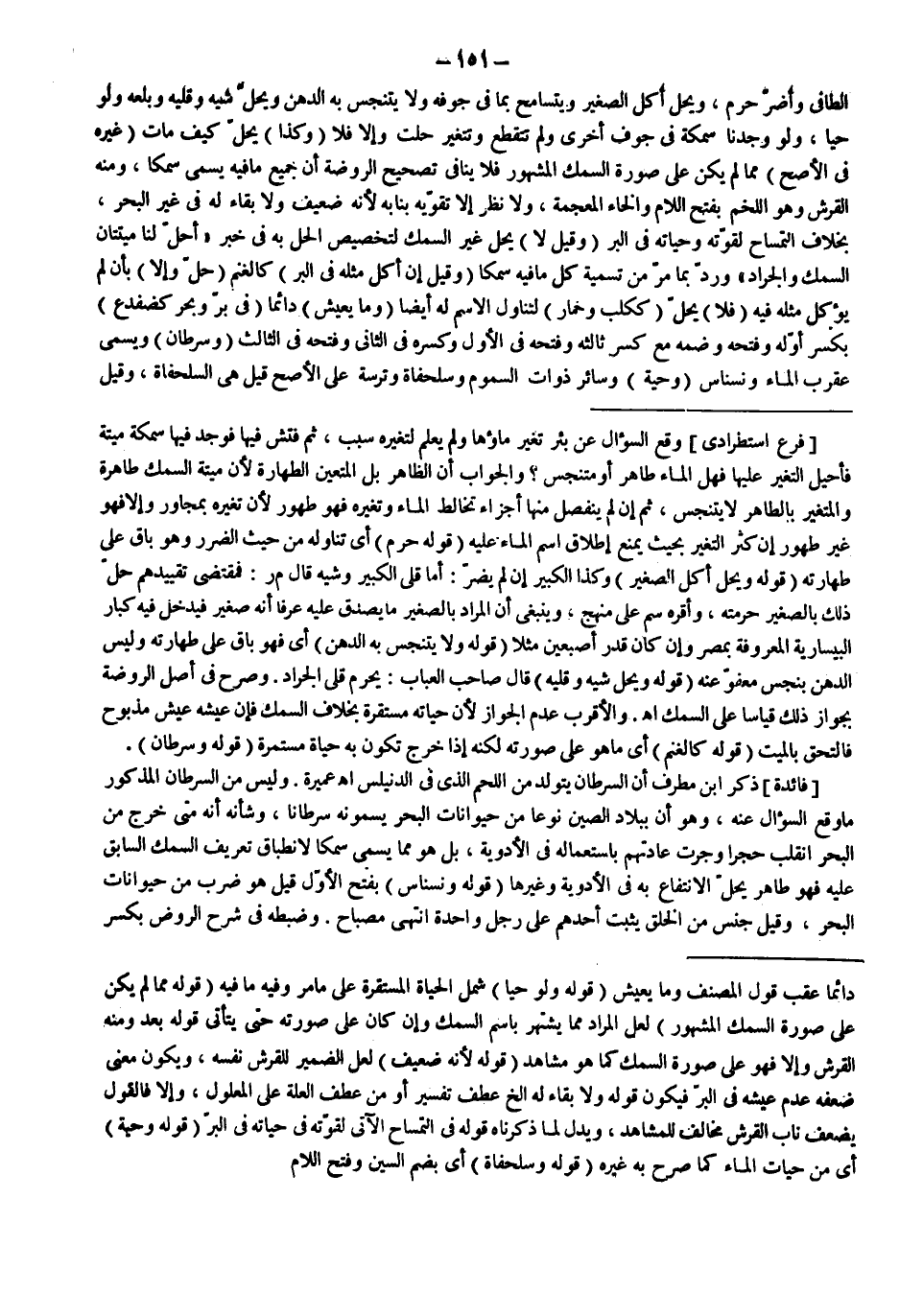 ـــــــــــــــــــــــــــــSفَرْعٌ اسْتِطْرَادِيٌّ] وَقَعَ السُّؤَالُ عَنْ بِئْرٍ تَغَيَّرَ مَاؤُهَا وَلَمْ يُعْلَمْ لِتَغَيُّرِهِ سَبَبٌ، ثُمًّ فَتَّشَ فِيهَا فَوَجَدَ فِيهَا سَمَكَةً مَيِّتَةً فَأُحِيلَ التَّغَيُّرُ عَلَيْهِ فَهَلْ الْمَاءُ طَاهِرٌ أَوْ مُتَنَجِّسٌ؟ وَالْجَوَابُ أَنَّ الظَّاهِرَ بَلْ الْمُتَعَيَّنَ الطَّهَارَةُ لِأَنَّ مَيْتَةَ السَّمَكِ طَاهِرَةٌ وَالْمُتَغَيِّرُ بِالطَّاهِرِ لَا يَتَنَجَّسُ، ثُمَّ إنْ لَمْ يَنْفَصِلْ مِنْهَا أَجْزَاءٌ تُخَالِطُ الْمَاءَ وَتُغَيِّرُهُ فَهُوَ طَهُورٌ لِأَنَّ تَغَيُّرَهُ بِمُجَاوِرٍ وَإِلَّا فَهُوَ غَيْرُ طَهُورٍ إنْ كَثُرَ التَّغَيُّرُ بِحَيْثُ يَمْنَعُ إطْلَاقَ اسْمِ الْمَاءِ عَلَيْهِ (قَوْلُهُ: حُرِّمَ) أَيْ تَنَاوُلُهُ مِنْ حَيْثُ الضَّرَرِ وَهُوَ بَاقٍ عَلَى طَهَارَتِهِ (قَوْلُهُ: وَيَحِلُّ أَكْلُ الصَّغِيرِ) وَكَذَا الْكَبِيرِ إنْ لَمْ يَضُرَّ: أَمَّا قَلْيُ الْكَبِيرِ وَشَيُّهُ قَالَ م ر: فَمُقْتَضَى تَقْيِيدِهِمْ حَلَّ ذَلِكَ بِالصَّغِيرِ حُرْمَتُهُ، وَأَقَرَّهُ سم عَلَى مَنْهَجٍ، وَيَنْبَغِي أَنَّ الْمُرَادَ بِالصَّغِيرِ مَا يَصْدُقُ عَلَيْهِ عُرْفًا أَنَّهُ صَغِيرٌ فَيَدْخُلُ فِيهِ كِبَارُ الْبِيسَارِيَةِ الْمَعْرُوفَةِ بِمِصْرَ وَإِنْ كَانَ قَدْرَ أُصْبُعَيْنِ مَثَلًا (قَوْلُهُ: وَلَا يَتَنَجَّسُ بِهِ الدُّهْنُ) أَيْ فَهُوَ بَاقٍ عَلَى طَهَارَتِهِ وَلَيْسَ الدُّهْنُ بِنَجَسٍ مَعْفُوٍّ عَنْهُ (قَوْلُهُ: وَيَحِلُّ شَيُّهُ وَقَلْيُهُ) قَالَ صَاحِبُ الْعُبَابِ: يَحْرُمُ قَلْيُ الْجَرَادِ.