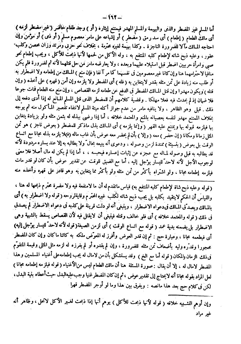 أَمَّا الْمُسْلِمُ غَيْرُ الْمُضْطَرِّ وَالذِّمِّيُّ وَالْبَهِيمَةُ وَالْمُسْلِمُ الْمُهْدَرُ فَيَمْتَنِعُ إيثَارُهُ (أَوْ) وَجَدَ طَعَامَ حَاضِرٍ (غَيْرِ مُضْطَرٍّ لَزِمَهُ) أَيْ مَالِكَ الطَّعَامِ (إطْعَامُ) أَيْ سَدُّ رَمَقِ (مُضْطَرٍّ) أَوْ إشْبَاعُهُ عَلَى مَا مَرَّ مَعْصُومٌ مُسْلِمٌ (أَوْ ذِمِّيٌّ) أَوْ مُؤْمِنٌ وَإِنْ احْتَاجَهُ الْمَالِكُ مَآلًا لِلضَّرُورَةِ النَّاجِزَةِ.