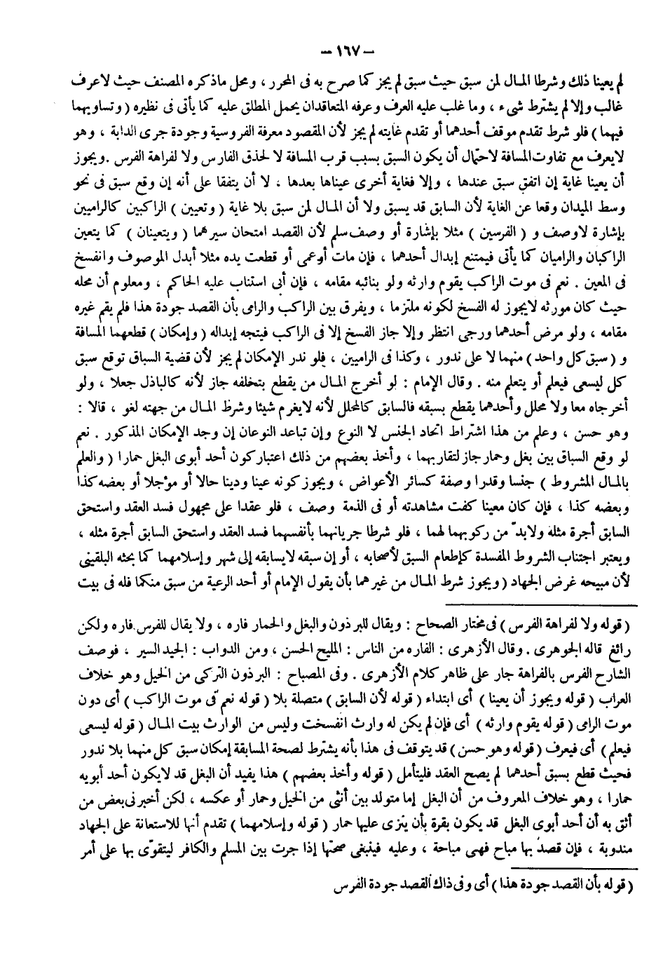 وَفِي الْمِصْبَاحِ: الْبِرْذَوْنُ التُّرْكِيُّ مِنْ الْخَيْلِ وَهُوَ خِلَافُ الْعِرَابِ (قَوْلُهُ: وَيَجُوزُ أَنْ يُعَيِّنَا) أَيْ ابْتِدَاءً (قَوْلُهُ: لِأَنَّ السَّابِقَ) مُتَّصِلَةٌ بِلَا (قَوْلُهُ: نَعَمْ فِي مَوْتِ الرَّاكِبِ) أَيْ دُونَ مَوْتِ الرَّامِي (قَوْلُهُ: يَقُومُ وَارِثُهُ) أَيْ فَإِنْ لَمْ يَكُنْ لَهُ وَارِثٌ انْفَسَخَتْ وَلَيْسَ مِنْ الْوَارِثِ بَيْتُ الْمَالِ (قَوْلُهُ: لِيَسْعَى فَيُعْلَمُ) أَيْ فَيُعْرَفُ (قَوْلُهُ: وَهُوَ حَسَنٌ) قَدْ يَتَوَقَّفُ فِي هَذَا بِأَنَّهُ يُشْتَرَطُ لِصِحَّةِ الْمُسَابَقَةِ إمْكَانُ سَبْقِ كُلٍّ مِنْهُمَا بِلَا نُدُورٍ فَحَيْثُ قُطِعَ بِسَبْقِ أَحَدِهِمَا لَمْ يَصِحَّ الْعَقْدُ فَلْيُتَأَمَّلْ (قَوْلُهُ: وَأَخَذَ بَعْضُهُمْ) هَذَا يُفِيدُ أَنَّ الْبَغْلَ قَدْ لَا يَكُونُ أَحَدُ أَبَوَيْهِ حِمَارًا، وَهُوَ خِلَافُ الْمَعْرُوفِ مِنْ أَنَّ الْبَغْلَ إمَّا مُتَوَلِّدٌ بَيْنَ أُنْثَى مِنْ الْخَيْلِ وَحِمَارٍ أَوْ عَكْسِهِ، لَكِنْ أَخْبَرَنِي بَعْضُ مَنْ أَثِقُ بِهِ أَنَّ أَحَدَ أَبَوَيْ الْبَغْلِ قَدْ يَكُونُ بَقَرَةً بِأَنْ يَنْزُوَ عَلَيْهَا حِمَارٌ (قَوْلُهُ: وَإِسْلَامُهُمَا) تَقَدَّمَ أَنَّهَا لِلِاسْتِعَانَةِ عَلَى الْجِهَادِ مَنْدُوبَةٌ، فَإِنْ قُصِدَ بِهَا مُبَاحٌ فَهِيَ مُبَاحَةٌ، وَعَلَيْهِ فَيَنْبَغِي صِحَّتُهَا إذَا جَرَتْ بَيْنَ الْمُسْلِمِ وَالْكَافِرِ لِيَتَقَوَّى بِهَا عَلَى أَمْرٍ