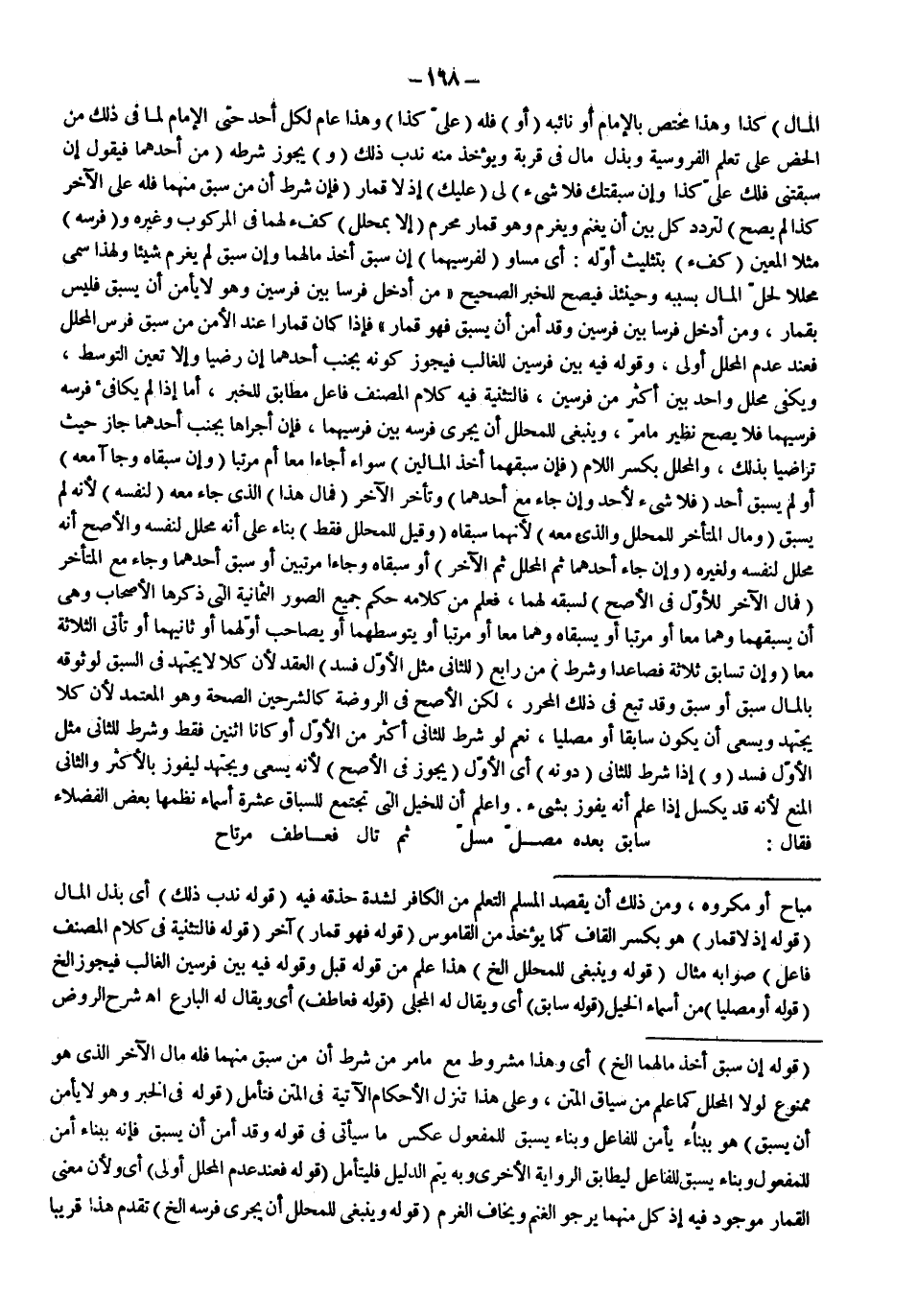 ـــــــــــــــــــــــــــــQقَوْلُهُ: إنْ سَبَقَ أَخَذَ مَالَهُمَا إلَخْ) أَيْ وَهَذَا مَشْرُوطٌ مَعَ مَا مَرَّ مِنْ شَرْطِ أَنَّ مَنْ سَبَقَ مِنْهُمَا فَلَهُ مَالُ الْآخَرِ الَّذِي هُوَ مَمْنُوعٌ لَوْلَا الْمُحَلَّلُ كَمَا عُلِمَ مِنْ سِيَاقِ الْمَتْنِ، وَعَلَى هَذَا تُنَزَّلُ الْأَحْكَامُ الْآتِيَةُ فِي الْمَتْنِ فَتَأَمَّلْ (قَوْلُهُ: فِي الْخَبَرِ وَهُوَ لَا يَأْمَنُ أَنْ يُسْبَقَ) هُوَ بِبِنَاءِ يَأْمَنُ لِلْفَاعِلِ وَبِنَاءُ يُسْبَقُ لِلْمَفْعُولِ عَكْسُ مَا سَيَأْتِي فِي قَوْلِهِ وَقَدْ أُمِنَ أَنْ يَسْبِقَ فَإِنَّهُ بِبِنَاءِ أُمِنَ لِلْمَفْعُولِ وَبِنَاءِ يَسْبِقُ لِلْفَاعِلِ لِيُطَابِقَ الرِّوَايَةَ الْأُخْرَى وَبِهِ يَتِمُّ الدَّلِيلُ فَلْيُتَأَمَّلْ (قَوْلُهُ: فَعِنْدَ عَدَمِ الْمُحَلِّلِ أَوْلَى) أَيْ وَلِأَنَّ مَعْنَى الْقِمَارِ مَوْجُودٌ فِيهِ إذْ كُلٌّ مِنْهُمَا يَرْجُو الْغُنْمَ وَيَخَافُ الْغُرْمَ (قَوْلُهُ وَيَنْبَغِي لِلْمُحَلِّلِ أَنْ يُجْرِيَ فَرَسَهُ إلَخْ) تَقَدَّمَ هَذَا قَرِيبًا.