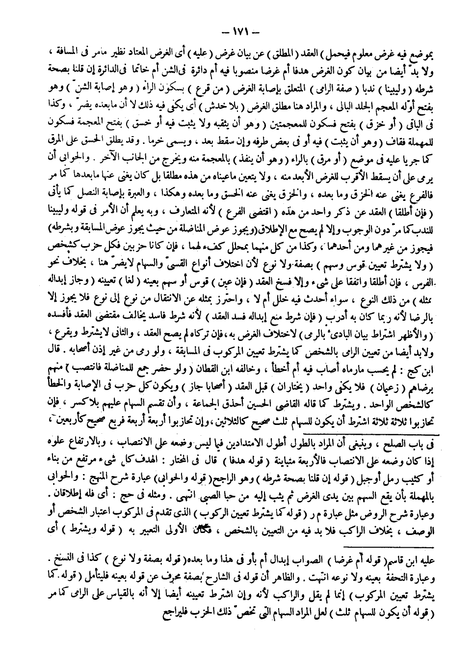 بِمَوْضِعٍ فِيهِ غَرَضٌ مَعْلُومٌ فَيُحْمَلُ) الْعَقْدُ (الْمُطْلَقُ) عَنْ بَيَانِ غَرَضٍ (عَلَيْهِ) أَيْ الْغَرَضِ الْمُعْتَادِ نَظِيرَ مَا مَرَّ فِي الْمَسَافَةِ، وَلَا بُدَّ أَيْضًا مِنْ بَيَانِ كَوْنِ الْغَرَضِ هَدَفًا أَمْ غَرَضًا مَنْصُوبًا فِيهِ أَمْ دَائِرَةً فِي الشَّنِّ أَمْ خَاتَمًا فِي الدَّائِرَةِ إنْ قُلْنَا بِصِحَّةِ شَرْطِهِ (وَلْيُبَيِّنَا) نَدْبًا (صِفَةَ الرَّامِي) الْمُتَعَلِّقِ بِإِصَابَةِ الْغَرَضِ (مِنْ قَرْعٍ) بِسُكُونِ الرَّاءِ (وَهُوَ إصَابَةُ الشَّنِّ) وَهُوَ بِفَتْحِ أَوَّلِهِ الْمُعْجَمِ الْجِلْدُ الْبَالِي، وَالْمُرَادُ هُنَا مُطْلَقُ الْغَرَضِ (بِلَا خَدْشٍ) أَيْ يَكْفِي فِيهِ ذَلِكَ لَا أَنَّ مَا بَعْدَهُ يَضُرُّ، وَكَذَا فِي الْبَاقِي (أَوْ خَزْقٍ) بِفَتْحٍ فَسُكُونٍ لِلْمُعْجَمَتَيْنِ (وَهُوَ أَنْ يَثْقُبَهُ وَلَا يَثْبُتَ فِيهِ أَوْ خَسْقٍ) بِفَتْحِ الْمُعْجَمَةِ فَسُكُونٍ لِلْمُهْمَلَةِ فَقَافٍ (وَهُوَ أَنْ يَثْبُتَ) فِيهِ أَوْ فِي بَعْضِ طَرَفِهِ وَإِنْ سَقَطَ بَعْدُ، وَيُسَمَّى خَرْمًا.