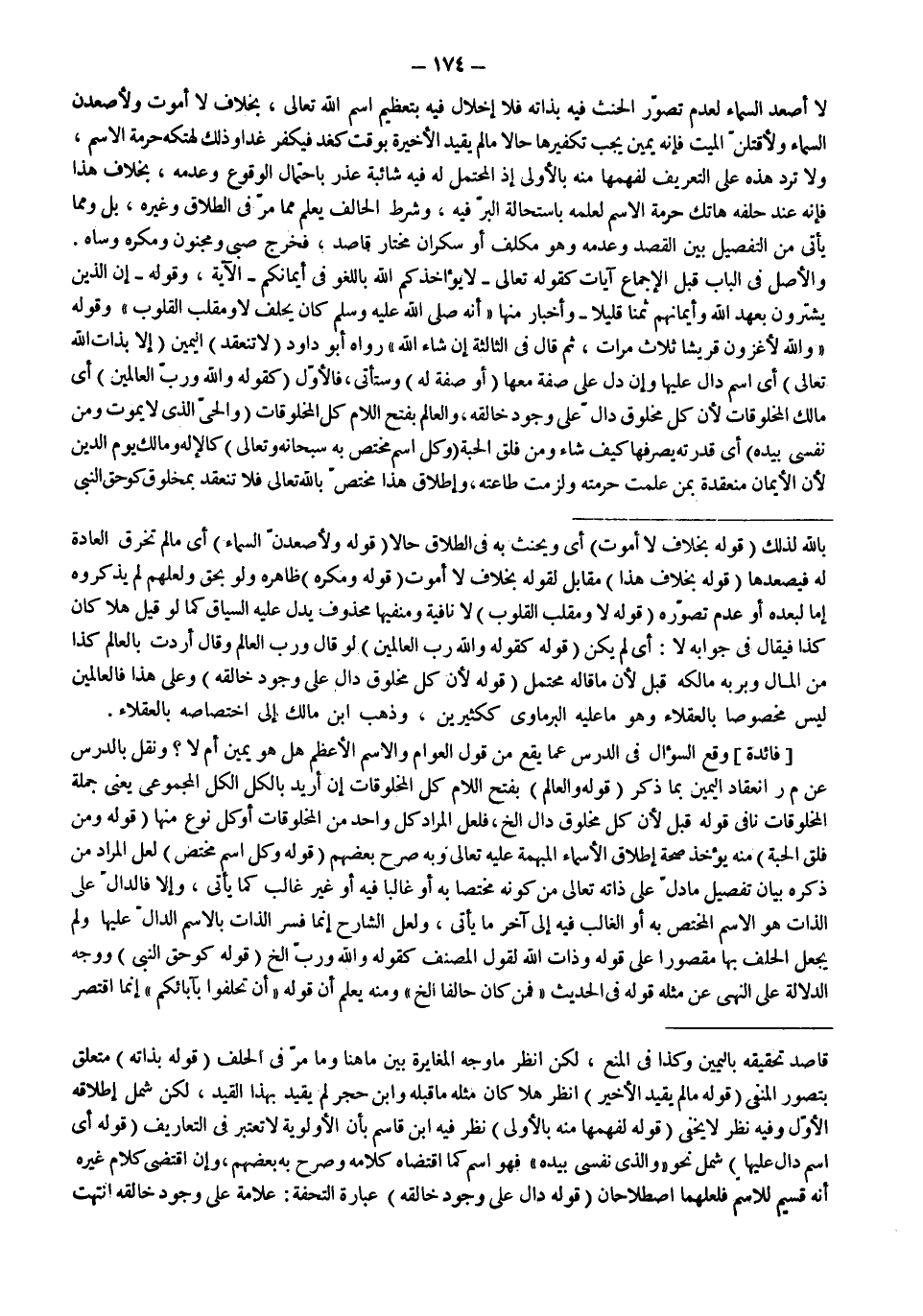 ـــــــــــــــــــــــــــــQقَاصِدٌ تَحْقِيقَهُ بِالْيَمِينِ وَكَذَا فِي الْمَنْعِ، لَكِنْ اُنْظُرْ مَا وَجْهُ الْمُغَايَرَةِ بَيْنَ مَا هُنَا وَمَا مَرَّ فِي الْحَلِفِ (قَوْلُهُ: بِذَاتِهِ) مُتَعَلِّقٌ بِتَصَوُّرِ الْمَنْفِيِّ (قَوْلُهُ: مَا لَمْ يُقَيِّدْ الْأَخِيرَ) اُنْظُرْ هَلَّا كَانَ مِثْلَهُ مَا قَبْلَهُ وَابْنُ حَجَرٍ لَمْ يُقَيِّدْ بِهَذَا الْقَيْدِ، لَكِنْ شَمَلَ إطْلَاقُهُ الْأَوَّلَ وَفِيهِ نَظَرٌ لَا يَخْفَى (قَوْلُهُ: لِفَهْمِهَا مِنْهُ بِالْأَوْلَى) نَظَرَ فِيهِ ابْنُ قَاسِمٍ بِأَنَّ الْأَوْلَوِيَّةَ لَا تُعْتَبَرُ فِي التَّعَارِيفِ (قَوْلُهُ: أَيْ اسْمٍ دَالٍّ عَلَيْهَا) شَمَلَ نَحْوَ " وَاَلَّذِي نَفْسِي بِيَدِهِ " فَهُوَ اسْمٌ كَمَا اقْتَضَاهُ كَلَامُهُ وَصَرَّحَ بِهِ بَعْضُهُمْ، وَإِنْ اقْتَضَى كَلَامُ غَيْرِهِ أَنَّهُ قَسِيمٌ لِلِاسْمِ فَلَعَلَّهُمَا اصْطِلَاحَانِ (قَوْلُهُ دَالٌّ عَلَى وُجُودِ خَالِقِهِ) عِبَارَةُ التُّحْفَةِ: عَلَامَةٌ عَلَى وُجُودِ خَالِقِهِ انْتَهَتْ