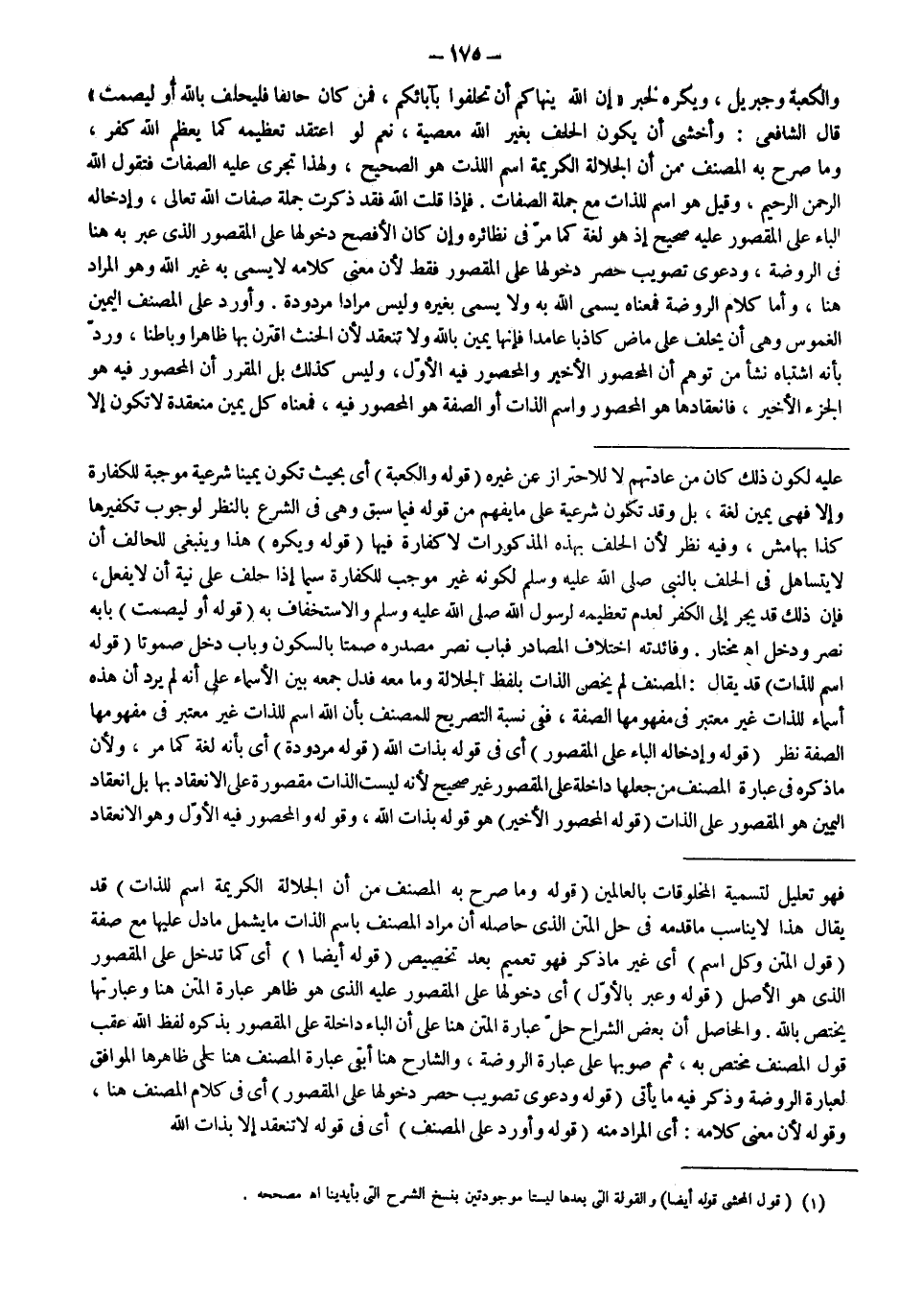 وَالْكَعْبَةِ وَجِبْرِيلَ، وَيُكْرَهُ لِخَبَرِ «إنَّ اللَّهَ يَنْهَاكُمْ أَنْ تَحْلِفُوا بِآبَائِكُمْ، فَمَنْ كَانَ حَالِفًا فَلْيَحْلِفْ بِاَللَّهِ أَوْ لِيَصْمُتْ» قَالَ الشَّافِعِيُّ: وَأَخْشَى أَنْ يَكُونَ الْحَلِفُ بِغَيْرِ اللَّهِ مَعْصِيَةً، نَعَمْ لَوْ اعْتَقَدَ تَعْظِيمَهُ كَمَا يُعَظِّمُ اللَّهَ كَفَرَ، وَمَا صَرَّحَ بِهِ الْمُصَنِّفُ مِنْ أَنَّ الْجَلَالَةَ الْكَرِيمَةَ اسْمٌ لِلذَّاتِ هُوَ الصَّحِيحُ، وَلِهَذَا تَجْرِي عَلَيْهِ الصِّفَاتُ فَتَقُولُ اللَّهُ الرَّحْمَنُ الرَّحِيمُ، وَقِيلَ هُوَ اسْمٌ لِلذَّاتِ مَعَ جُمْلَةِ الصِّفَاتِ. فَإِذَا قُلْتَ اللَّهُ فَقَدْ ذَكَرْتَ جُمْلَةَ صِفَاتِ اللَّهِ تَعَالَى، وَإِدْخَالُهُ الْبَاءَ عَلَى الْمَقْصُورِ عَلَيْهِ صَحِيحٌ إذْ هُوَ لُغَةٌ كَمَا مَرَّ فِي نَظَائِرِهِ وَإِنْ كَانَ الْأَفْصَحُ دُخُولَهَا عَلَى الْمَقْصُورِ الَّذِي عَبَّرَ بِهِ هُنَا فِي الرَّوْضَةِ، وَدَعْوَى تَصْوِيبِ حَصْرِ دُخُولِهَا عَلَى الْمَقْصُورِ فَقَطْ لِأَنَّ مَعْنَى كَلَامِهِ لَا يُسَمَّى بِهِ غَيْرُ اللَّهِ وَهُوَ الْمُرَادُ هُنَا، وَأَمَّا كَلَامُ الرَّوْضَةِ فَمَعْنَاهُ يُسَمَّى اللَّهُ بِهِ وَلَا يُسَمَّى بِغَيْرِهِ وَلَيْسَ مُرَادًا مَرْدُودَةٌ.