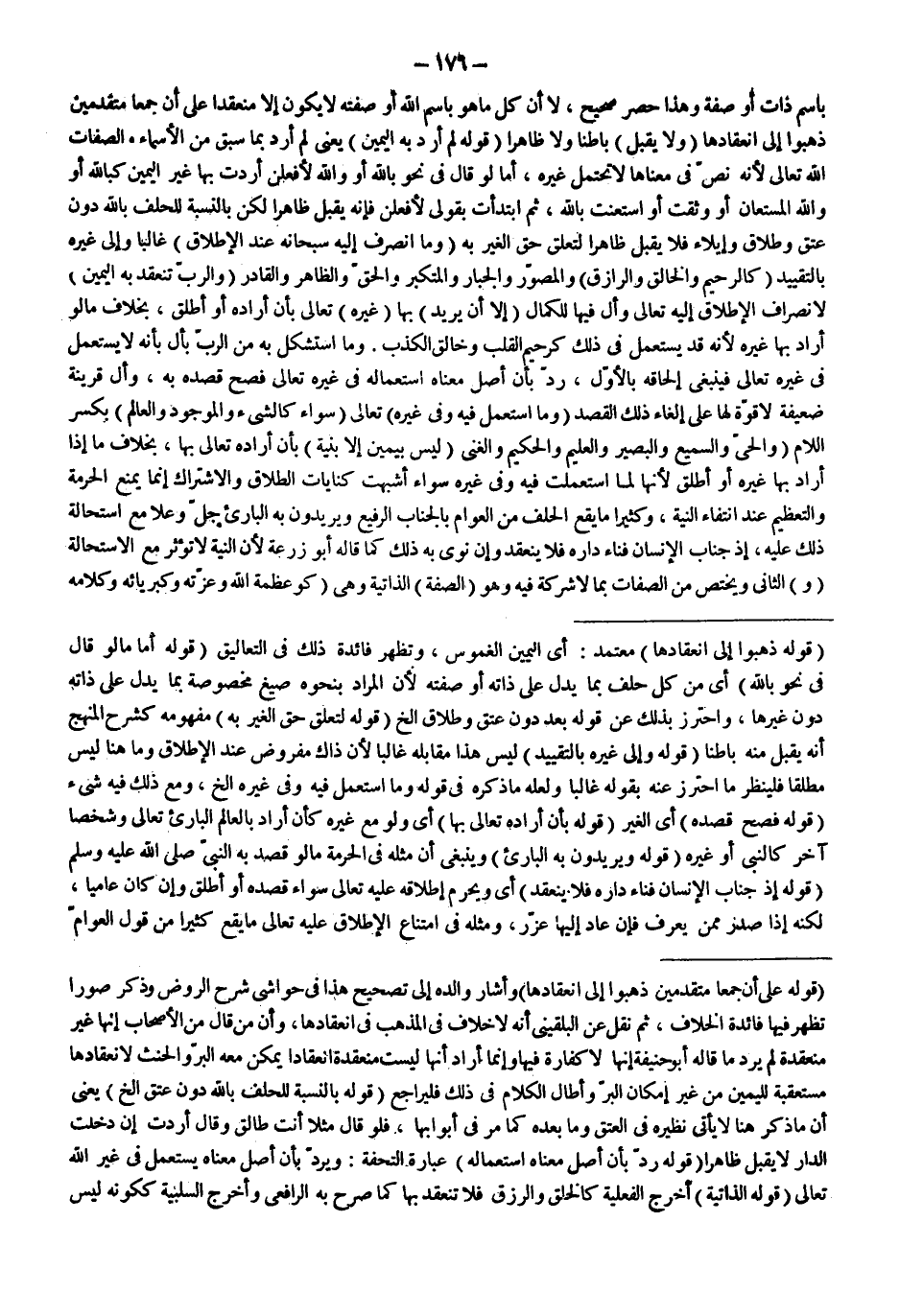 ـــــــــــــــــــــــــــــQقَوْلُهُ: عَلَى أَنَّ جَمْعًا مُتَقَدِّمِينَ ذَهَبُوا إلَى انْعِقَادِهَا) وَأَشَارَ وَالِدُهُ إلَى تَصْحِيحِ هَذَا فِي حَوَاشِي شَرْحِ الرَّوْضِ وَذَكَرَ صُوَرًا تَظْهَرُ فِيهَا فَائِدَةُ الْخِلَافِ، ثُمَّ نَقَلَ عَنْ الْبُلْقِينِيِّ أَنَّهُ لَا خِلَافَ فِي الْمَذْهَبِ فِي انْعِقَادِهَا، وَأَنَّ مَنْ قَالَ مِنْ الْأَصْحَابِ إنَّهَا غَيْرُ مُنْعَقِدَةٍ لَمْ يُرِدْ مَا قَالَهُ أَبُو حَنِيفَةَ إنَّهَا لَا كَفَّارَةَ فِيهَا وَإِنَّمَا أَرَادَ أَنَّهَا لَيْسَتْ مُنْعَقِدَةً انْعِقَادًا يُمْكِنُ مَعَهُ الْبِرُّ وَالْحِنْثُ لِانْعِقَادِهَا مُسْتَعْقِبَةً لِلْيَمِينِ مِنْ غَيْرِ إمْكَانِ الْبِرِّ وَأَطَالَ الْكَلَامَ فِي ذَلِكَ فَلْيُرَاجَعْ (قَوْلُهُ: بِالنِّسْبَةِ لِلْحَلِفِ بِاَللَّهِ دُونَ عِتْقٍ إلَخْ) يَعْنِي أَنَّ مَا ذَكَرَ هُنَا لَا يَأْتِي نَظِيرُهُ فِي الْعِتْقِ وَمَا بَعْدَهُ كَمَا مَرَّ فِي أَبْوَابِهَا، فَلَوْ قَالَ مَثَلًا أَنْت طَالِقٌ وَقَالَ أَرَدْت إنْ دَخَلْت الدَّارَ لَا يُقْبَلُ ظَاهِرًا (قَوْلُهُ رُدَّ بِأَنَّ أَصْلَ مَعْنَاهُ اسْتِعْمَالُهُ) عِبَارَةُ التُّحْفَةِ: وَيَرِدُ بِأَنَّ أَصْلَ مَعْنَاهُ يُسْتَعْمَلُ فِي غَيْرِ اللَّهِ تَعَالَى (قَوْلُهُ: الذَّاتِيَّةُ) أَخْرَجَ الْفِعْلِيَّةَ كَالْخَلْقِ وَالرِّزْقِ فَلَا تَنْعَقِدُ بِهَا كَمَا صَرَّحَ بِهِ الرَّافِعِيُّ وَأَخْرَجَ السَّلْبِيَّةَ كَكَوْنِهِ لَيْسَ