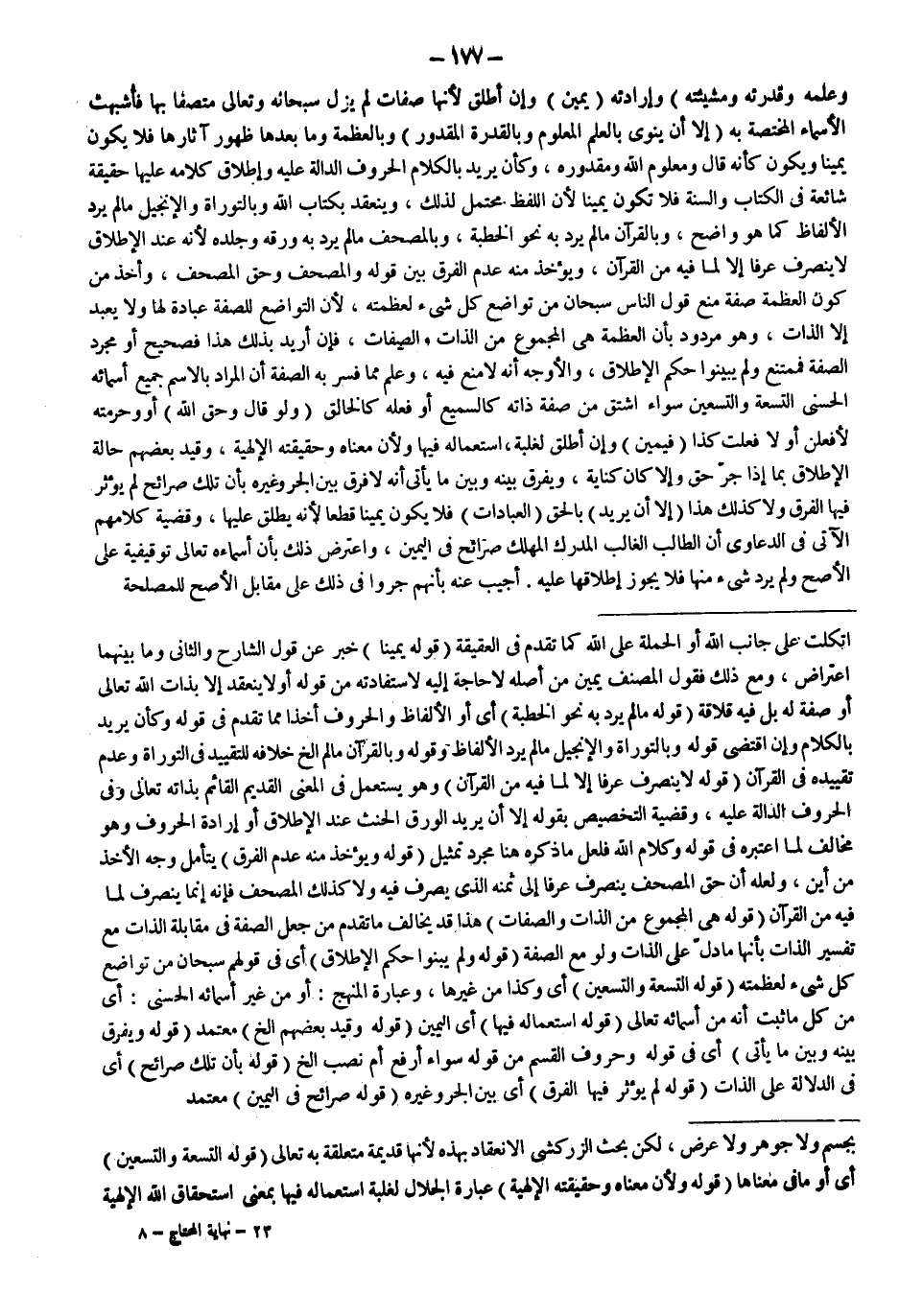 وَعِلْمِهِ وَقُدْرَتِهِ وَمَشِيئَتِهِ) وَإِرَادَتِهِ (يَمِينٌ) وَإِنْ أَطْلَقَ لِأَنَّهَا صِفَاتٌ لَمْ يَزَلْ سُبْحَانَهُ وَتَعَالَى مُتَّصِفًا بِهَا فَأَشْبَهَتْ الْأَسْمَاءَ الْمُخْتَصَّةَ بِهِ (إلَّا أَنْ يَنْوِيَ بِالْعِلْمِ الْمَعْلُومَ وَبِالْقُدْرَةِ الْمَقْدُورَ) وَبِالْعَظَمَةِ وَمَا بَعْدَهَا ظُهُورَ آثَارِهَا فَلَا يَكُونُ يَمِينًا وَيَكُونُ كَأَنَّهُ قَالَ وَمَعْلُومِ اللَّهِ وَمَقْدُورِهِ، وَكَأَنْ يُرِيدَ بِالْكَلَامِ الْحُرُوفَ الدَّالَّةَ عَلَيْهِ وَإِطْلَاقُ كَلَامِهِ عَلَيْهَا حَقِيقَةٌ شَائِعَةٌ فِي الْكِتَابِ وَالسُّنَّةِ فَلَا تَكُونُ يَمِينًا لِأَنَّ اللَّفْظَ مُحْتَمِلٌ لِذَلِكَ، وَيَنْعَقِدُ بِكِتَابِ اللَّهِ وَبِالتَّوْرَاةِ وَالْإِنْجِيلِ مَا لَمْ يُرِدْ الْأَلْفَاظَ كَمَا هُوَ وَاضِحٌ، وَبِالْقُرْآنِ مَا لَمْ يُرِدْ بِهِ نَحْوَ الْخُطْبَةِ، وَبِالْمُصْحَفِ مَا لَمْ يُرِدْ بِهِ وَرَقَهُ وَجِلْدَهُ لِأَنَّهُ عِنْدَ الْإِطْلَاقِ لَا يَنْصَرِفُ عُرْفًا إلَّا لِمَا فِيهِ مِنْ الْقُرْآنِ، وَيُؤْخَذُ مِنْهُ عَدَمُ الْفَرْقِ بَيْنَ قَوْلِهِ وَالْمُصْحَفِ وَحَقِّ الْمُصْحَفِ، وَأُخِذَ مِنْ كَوْنِ الْعَظَمَةِ صِفَةً مَعَ قَوْلِ النَّاسِ سُبْحَانَ مَنْ تَوَاضَعَ كُلُّ شَيْءٍ لِعَظَمَتِهِ، لِأَنَّ التَّوَاضُعَ لِلصِّفَةِ عِبَادَةٌ لَهَا وَلَا يُعْبَدُ إلَّا الذَّاتُ، وَهُوَ مَرْدُودٌ بِأَنَّ الْعَظَمَةَ هِيَ الْمَجْمُوعُ مِنْ الذَّاتِ وَالصِّفَاتِ، فَإِنْ أُرِيدَ بِذَلِكَ هَذَا فَصَحِيحٌ أَوْ مُجَرَّدُ الصِّفَةِ فَمُمْتَنِعٌ وَلَمْ يُبَيِّنُوا حُكْمَ الْإِطْلَاقِ، وَالْأَوْجَهُ أَنَّهُ لَا مَنْعَ فِيهِ، وَعُلِمَ مِمَّا فُسِّرَ بِهِ الصِّفَةُ أَنَّ الْمُرَادَ بِالِاسْمِ جَمِيعُ أَسْمَائِهِ الْحُسْنَى التِّسْعَةِ وَالتِّسْعِينَ سَوَاءٌ اُشْتُقَّ مِنْ صِفَةِ ذَاتِهِ كَالسَّمِيعِ أَوْ فِعْلِهِ كَالْخَالِقِ