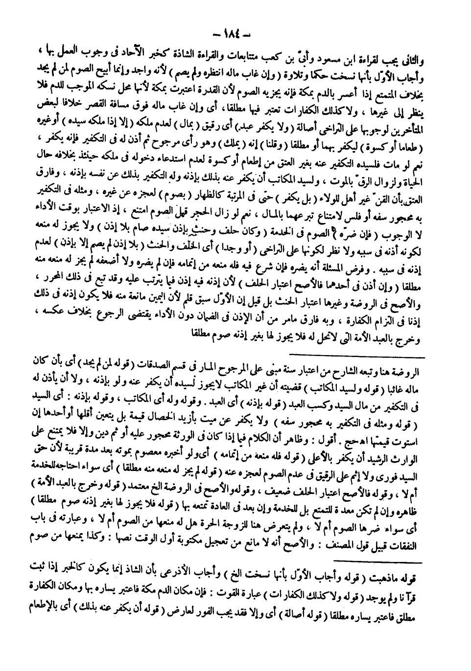 أَقُولُ: وَظَاهِرٌ أَنَّ الْكَلَامَ فِيمَا إذَا كَانَ فِي الْوَرَثَةِ مَحْجُورٌ عَلَيْهِ أَوْ ثَمَّ دَيْنٌ وَإِلَّا فَلَا يَمْتَنِعُ عَلَى الْوَارِثِ الرَّشِيدِ أَنْ يُكَفِّرَ بِالْأَعْلَى (قَوْلُهُ: فَلَهُ مَنْعُهُ مِنْ إتْمَامِهِ) أَيْ وَلَوْ أَخْبَرَهُ مَعْصُومٌ بِمَوْتِهِ بَعْدَ مُدَّةٍ قَرِيبَةٍ لِأَنَّ حَقَّ السَّيِّدِ فَوْرِيٌّ وَلَا إثْمَ عَلَى الرَّقِيقِ فِي عَدَمِ الصَّوْمِ لِعَجْزِهِ عَنْهُ (قَوْلُهُ: لَمْ يَجُزْ لَهُ مَنْعُهُ مِنْهُ مُطْلَقًا) أَيْ سَوَاءٌ احْتَاجَهُ لِلْخِدْمَةِ أَمْ لَا، وَقَوْلُهُ فَالْأَصَحُّ اعْتِبَارُ الْحَلِفِ ضَعِيفٌ، وَقَوْلُهُ وَالْأَصَحُّ فِي الرَّوْضَةِ إلَخْ مُعْتَمَدٌ (قَوْلُهُ: وَخَرَجَ بِالْعَبْدِ الْأَمَةُ) ظَاهِرُهُ وَإِنْ لَمْ تَكُنْ مُعَدَّةً لِلتَّمَتُّعِ بَلْ لِلْخِدْمَةِ وَإِنْ بَعُدَ فِي الْعَادَةِ تَمَتُّعُهُ بِهَا (قَوْلُهُ: فَلَا يَجُوزُ لَهَا بِغَيْرِ إذْنِهِ صَوْمٌ مُطْلَقًا) أَيْ سَوَاءٌ ضَرَّهَا الصَّوْمُ أَمْ لَا، وَلَمْ يَتَعَرَّضْ هُنَا لِلزَّوْجَةِ الْحُرَّةِ هَلْ لَهُ مَنْعُهَا مِنْ الصَّوْمِ أَمْ لَا، وَعِبَارَتُهُ فِي بَابِ النَّفَقَاتِ قُبَيْلَ قَوْلِ الْمُصَنِّفِ: وَالْأَصَحُّ أَنَّهُ لَا مَانِعَ مِنْ تَعْجِيلِ مَكْتُوبَةٍ أَوَّلَ الْوَقْتِ نَصُّهَا: وَكَذَا يَمْنَعُهَا مِنْ صَوْمِ