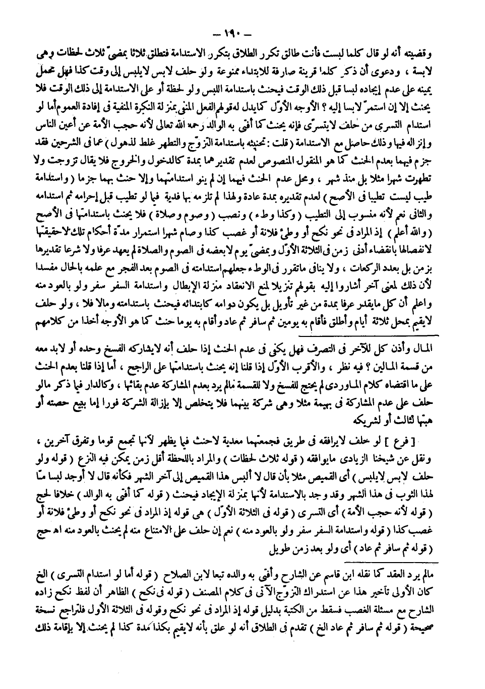 لِأَنَّ ذَلِكَ لِمَعْنًى آخَرَ أَشَارُوا إلَيْهِ بِقَوْلِهِمْ تَنْزِيلًا لِمَنْعِ الِانْعِقَادِ مَنْزِلَةَ الْإِبْطَالِ وَاسْتِدَامَةُ السَّفَرِ سَفَرٌ وَلَوْ بِالْعَوْدِ مِنْهُ وَاعْلَمْ أَنَّ كُلَّ مَا يُقَدَّرُ عُرْفًا بِمُدَّةٍ مِنْ غَيْرِ تَأْوِيلٍ بَلْ يَكُونُ دَوَامُهُ كَابْتِدَائِهِ فَيَحْنَثُ بِاسْتِدَامَتِهِ وَمَا لَا فَلَا، وَلَوْ حَلَفَ لَا يُقِيمُ بِمَحَلٍّ ثَلَاثَةَ أَيَّامٍ وَأَطْلَقَ فَأَقَامَ بِهِ يَوْمَيْنِ ثُمَّ سَافَرَ ثُمَّ عَادَ وَأَقَامَ بِهِ يَوْمًا حَنِثَ كَمَا هُوَ الْأَوْجَهُ أَخْذًا مِنْ كَلَامِهِمْ