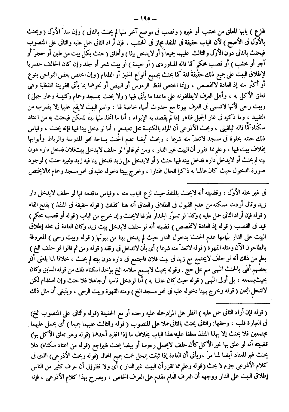 ـــــــــــــــــــــــــــــSفِي غَيْرِ مَحَلِّهِ الْأَوَّلِ، وَقَضِيَّتُهُ أَنَّهُ لَا يَحْنَثْ بِالْمَنْفَذِ حَيْثُ نُزِعَ الْبَابُ مِنْهُ، وَقِيَاسُ مَا قَدَّمَهُ فِيمَا لَوْ حَلَفَ لَا يَدْخُلُ دَارَ زَيْدٍ وَقَالَ أَرَدْت مَسْكَنَهُ مِنْ عَدَمِ الْقَبُولِ فِي الطَّلَاقِ وَالْعَتَاقِ أَنَّهُ هُنَا كَذَلِكَ (قَوْلُهُ حَقِيقَةٌ فِي الْمَنْفَذِ) بِفَتْحِ الْفَاءِ (قَوْلُهُ: فَإِنْ أَرَادَ الثَّانِي حُمِلَ عَلَيْهِ) وَكَذَا لَوْ تَسَوَّرَ الْجِدَارَ فَنَزَلَهَا لَا يَحْنَثُ وَإِنْ خَرَجَ مِنْ الْبَابِ (قَوْلُهُ: أَوْ قَصَبٍ مُحْكِمٍ) قَيْدٌ فِي الْقَصَبِ (قَوْلُهُ: إذْ الْعَادَةُ لَا تُخَصِّصُ) قَضِيَّتُهُ أَنَّهُ لَوْ حَلَفَ لَا يَدْخُلُ بَيْتَ زَيْدٍ وَكَانَ الْعَادَةُ فِي مَحَلِّهِ إطْلَاقُ الْبَيْتِ عَلَى الدَّارِ بِتَمَامِهَا عَدَمُ الْحِنْثِ بِدُخُولِ الدَّارِ حَيْثُ لَمْ يَدْخُلْ بَيْتًا مِنْ بُيُوتِهَا (قَوْلُهُ: وَبَيْتِ رَحًى) الْمَعْرُوفَةِ بِالطَّاحُونِ الْآنَ وَمِثْلُهُ الْقَهْوَةُ (قَوْلُهُ: لَا تُعَدُّ مِنْهُ شَرْعًا) أَيْ بِأَنْ لَا تَدْخُلَ فِي وَقْفِهِ (قَوْلُهُ: وَمِنْ ثَمَّ قَالُوا لَوْ حَلَفَ إلَخْ) يُعْلَمُ مِنْ ذَلِكَ أَنَّهُ لَوْ حَلَفَ لَا يَجْتَمِعُ مَعَ زَيْدٍ فِي بَيْتِ فُلَانٍ فَاجْتَمَعَ فِي دَارِهِ دُونَ بَيْتِهِ لَمْ يَحْنَثْ، خِلَافًا لِمَا بَلَغَنِي أَنَّ بَعْضَهُمْ أَفْتَى بِالْحِنْثِ انْتَهَى سم عَلَى حَجّ.