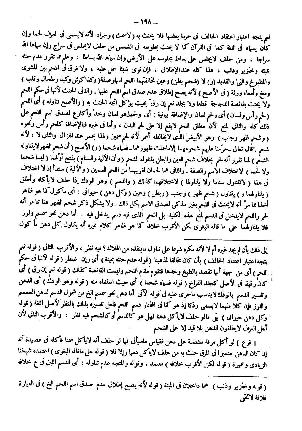 ـــــــــــــــــــــــــــــSإلَى ذَلِكَ بِأَنْ لَمْ يَجِدْ غَيْرَهُ أَمْ لَا لِأَنَّهُ مُكْرَهٌ شَرْعًا عَلَى تَنَاوُلِ مَا يُنْقِذُهُ مِنْ الْهَلَاكِ؟ فِيهِ نَظَرٌ، وَالْأَقْرَبُ الثَّانِي (قَوْلُهُ: نَعَمْ يُتَّجَهُ اعْتِبَارُ اعْتِقَادِ الْحَالِفِ) بِأَنْ كَانَ مُخَالِفًا لِمَذْهَبِنَا (قَوْلُهُ عَدَمُ حِنْثِهِ بِمَيْتَةٍ) أَيْ وَإِنْ اُضْطُرَّ (قَوْلُهُ: لِأَنَّهَا فِي حُكْمِ اللَّحْمِ) أَيْ مِنْ جِهَةِ أَنَّهَا تُقْصَدُ بِالطَّبْخِ وَحْدَهَا فَتَقُومُ مَقَامَ اللَّحْمِ وَلَيْسَتْ الْقَانِصَةُ كَذَلِكَ (قَوْلُهُ: نَعَمْ إنْ رَقَّ) أَيْ كَانَ رَقِيقًا فِي الْأَصْلِ كَجِلْدِ الْفِرَاخِ (قَوْلُهُ: فَسَمَّاهُ شَحْمًا) أَيْ حَيْثُ اسْتَثْنَاهُ مِنْهُ (قَوْلُهُ: وَهُوَ الْوَدَكُ) أَيْ الدُّهْنُ وَتَفْسِيرُ الدَّسَمِ بِالْوَدَكِ لَا يُنَاسِبُ مَا جَرَى عَلَيْهِ فِي قَوْلِهِ الْآتِي أَمَّا دُهْنُ نَحْوِ سِمْسِمٍ إلَخْ مِنْ شُمُولِ الدَّسَمِ لِدُهْنِ السِّمْسِمِ وَاللَّوْزِ فَإِنَّ كُلًّا مِنْهُمَا لَا يُسَمَّى وَدَكًا إذْ هُوَ كَمَا فِي الْمُخْتَارِ دَسَمُ اللَّحْمِ فَلَعَلَّ تَفْسِيرَهُ بِذَلِكَ بِالنَّظَرِ لِأَصْلِ اللُّغَةِ (قَوْلُهُ: وَكُلُّ دُهْنٍ حَيَوَانِيٍّ) بَقِيَ مَا لَوْ حَلَفَ لَا يَأْكُلُ دُهْنًا فَهَلْ هُوَ كَالدَّسَمِ أَوْ كَالشَّحْمِ فِيهِ نَظَرٌ، وَالْأَقْرَبُ الثَّانِي لِأَنَّ أَهْلَ الْعُرْفِ لَا يُطْلِقُونَ الدُّهْنَ بِلَا قَيْدٍ إلَّا عَلَى الشَّحْمِ