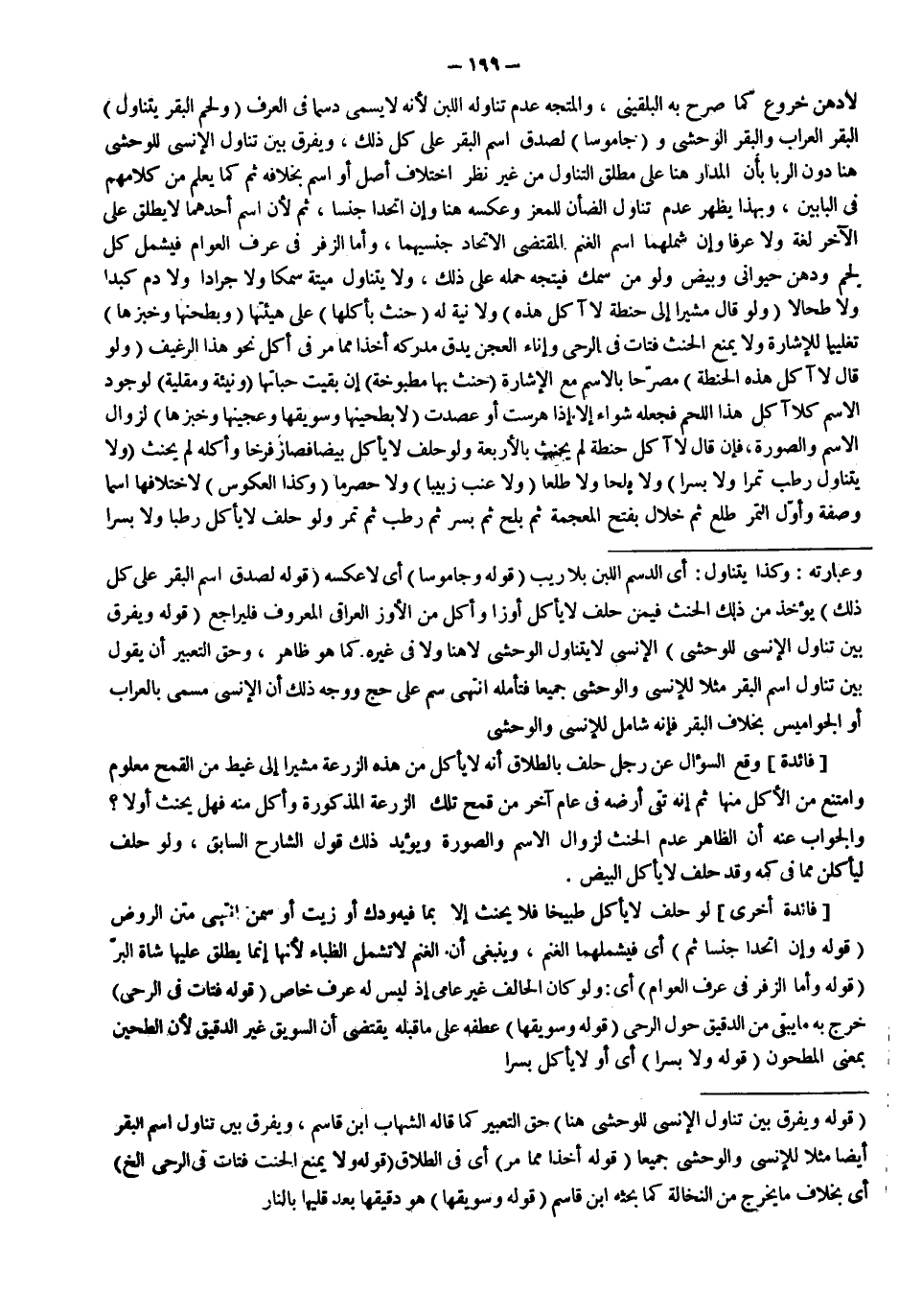 ـــــــــــــــــــــــــــــSوَعِبَارَتُهُ: وَكَذَا يُتَنَاوَلُ: أَيْ الدَّسَمُ اللَّبَنَ بِلَا رَيْبٍ (قَوْلُهُ: وَجَامُوسًا) أَيْ لَا عَكْسَهُ (قَوْلُهُ: لِصِدْقِ اسْمِ الْبَقَرِ عَلَى كُلِّ ذَلِكَ) يُؤْخَذُ مِنْ ذَلِكَ الْحِنْثُ فِيمَنْ حَلَفَ لَا يَأْكُلُ إوَزًّا وَأَكَلَ مِنْ الْإِوَزِّ الْعِرَاقِيِّ الْمَعْرُوفِ فَلْيُرَاجَعْ (قَوْلُهُ: وَيُفَرَّقُ بَيْنَ تَنَاوُلِ الْإِنْسِيِّ لِلْوَحْشِيِّ) الْإِنْسِيِّ لَا يَتَنَاوَلُ الْوَحْشِيَّ لَا هُنَا وَلَا فِي غَيْرِهِ كَمَا هُوَ ظَاهِرٌ، وَحَقُّ التَّعْبِيرِ أَنْ يَقُولَ بَيْنَ تَنَاوُلِ اسْمِ الْبَقَرِ مَثَلًا لِلْإِنْسِيِّ وَالْوَحْشِيِّ جَمِيعًا فَتَأَمَّلْهُ انْتَهَى سم عَلَى حَجّ وَوَجْهُ ذَلِكَ أَنَّ الْإِنْسِيَّ مُسَمًّى بِالْعِرَابِ أَوْ الْجَوَامِيسِ بِخِلَافِ الْبَقَرِ فَإِنَّهُ شَامِلٌ لِلْإِنْسِيِّ وَالْوَحْشِيِّ.