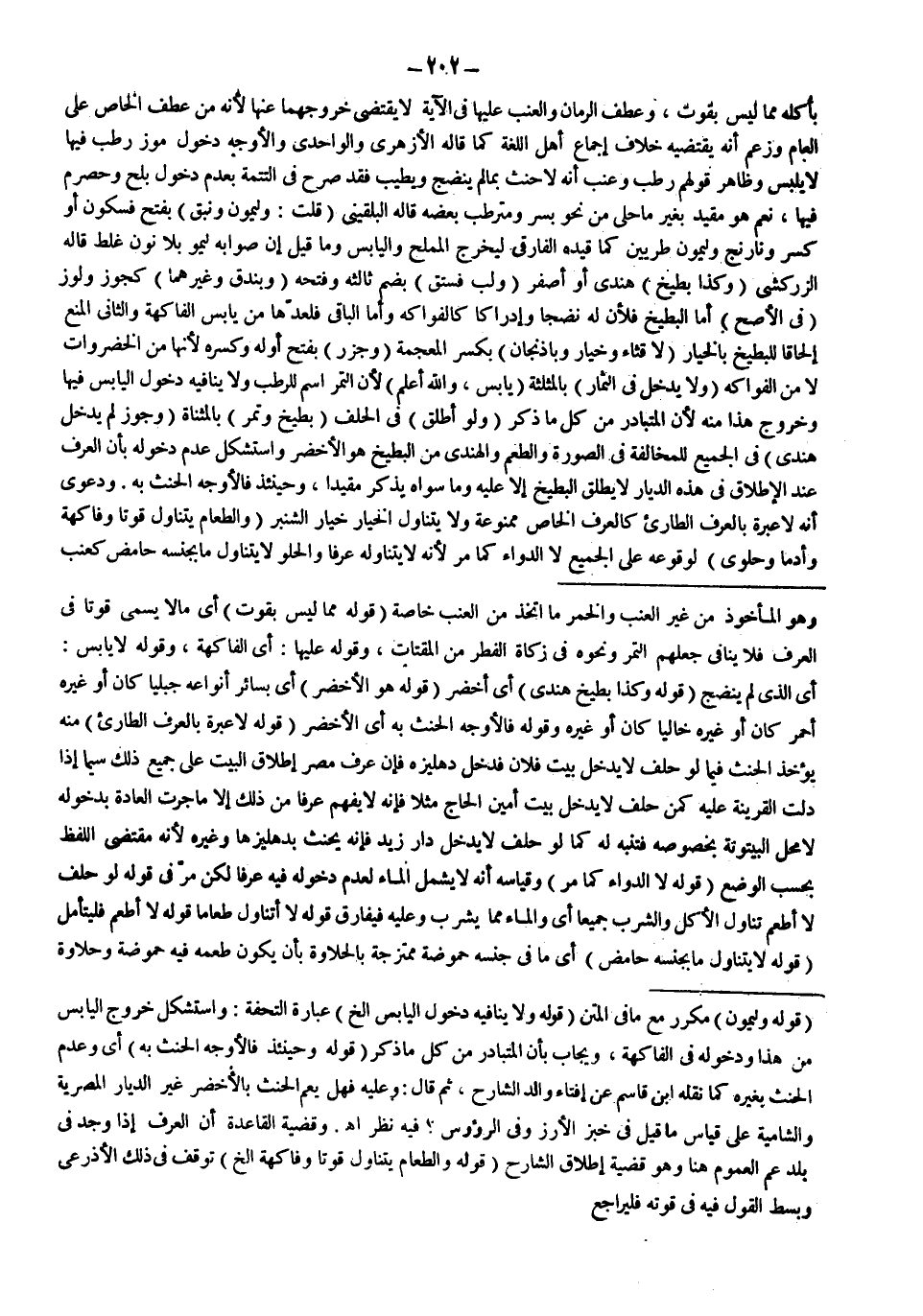 (قَوْلُهُ: مِمَّا لَيْسَ بِقُوتٍ) أَيْ مَا لَا يُسَمَّى قُوتًا فِي الْعُرْفِ فَلَا يُنَافِي جَعْلَهُمْ التَّمْرَ وَنَحْوَهُ فِي زَكَاةِ الْفِطْرِ مِنْ الْمُقْتَاتِ، وَقَوْلُهُ عَلَيْهَا: أَيْ الْفَاكِهَةِ، وَقَوْلُهُ لَا يَابِسٍ: أَيْ الَّذِي لَمْ يَنْضَجْ (قَوْلُهُ: وَكَذَا بِطِّيخٌ هِنْدِيٌّ) أَيْ أَخْضَرُ (قَوْلُهُ: هُوَ الْأَخْضَرُ) أَيْ بِسَائِرِ أَنْوَاعِهِ جَبَلِيًّا كَانَ أَوْ غَيْرَهُ أَحْمَرَ كَانَ أَوْ غَيْرَهُ خَالِيًا كَانَ أَوْ غَيْرَهُ وَقَوْلُهُ فَالْأَوْجَهُ الْحِنْثُ بِهِ أَيْ الْأَخْضَرِ (قَوْلُهُ لَا عِبْرَةَ بِالْعُرْفِ الطَّارِئِ) مِنْهُ يُؤْخَذُ الْحِنْثُ فِيمَا لَوْ حَلَفَ لَا يَدْخُلُ بَيْتَ فُلَانٍ فَدَخَلَ دِهْلِيزَهُ فَإِنَّ عُرْفَ مِصْرَ إطْلَاقُ الْبَيْتِ عَلَى جَمِيعِ ذَلِكَ سِيَّمَا إذَا دَلَّتْ الْقَرِينَةُ عَلَيْهِ كَمَنْ حَلَفَ لَا يَدْخُلُ بَيْتَ أَمِينِ الْحَاجِّ مَثَلًا فَإِنَّهُ لَا يُفْهَمُ عُرْفًا مِنْ ذَلِكَ إلَّا مَا جَرَتْ الْعَادَةُ بِدُخُولِهِ لَا مَحَلُّ الْبَيْتُوتَةِ بِخُصُوصِهِ فَتَنَبَّهْ لَهُ كَمَا لَوْ حَلَفَ لَا يَدْخُلُ دَارَ زَيْدٍ فَإِنَّهُ يَحْنَثُ بِدِهْلِيزِهَا وَغَيْرِهِ لِأَنَّهُ مُقْتَضَى اللَّفْظِ بِحَسْبِ الْوَضْعِ (قَوْلُهُ: لَا الدَّوَاءُ كَمَا مَرَّ) وَقِيَاسُهُ أَنَّهُ لَا يَشْمَلُ الْمَاءَ لِعَدَمِ دُخُولِهِ فِيهِ عُرْفًا لَكِنْ مَرَّ فِي قَوْلِهِ لَوْ حَلَفَ لَا أَطْعَمُ تَنَاوَلَ الْأَكْلَ وَالشُّرْبَ جَمِيعًا أَيْ وَالْمَاءَ مِمَّا يُشْرَبُ وَعَلَيْهِ فَيُفَارِقُ قَوْلَهُ لَا أَتَنَاوَلُ طَعَامًا قَوْلُهُ لَا أَطْعَمُ فَلْيُتَأَمَّلْ (قَوْلُهُ: لَا يَتَنَاوَلُ مَا بِجِنْسِهِ حَامِضٌ) أَيْ مَا فِي جِنْسِهِ حُمُوضَةٌ مُمْتَزِجَةٌ بِالْحَلَاوَةِ بِأَنْ يَكُونَ طَعْمُهُ فِيهِ حُمُوضَةٌ وَحَلَاوَةٌ
