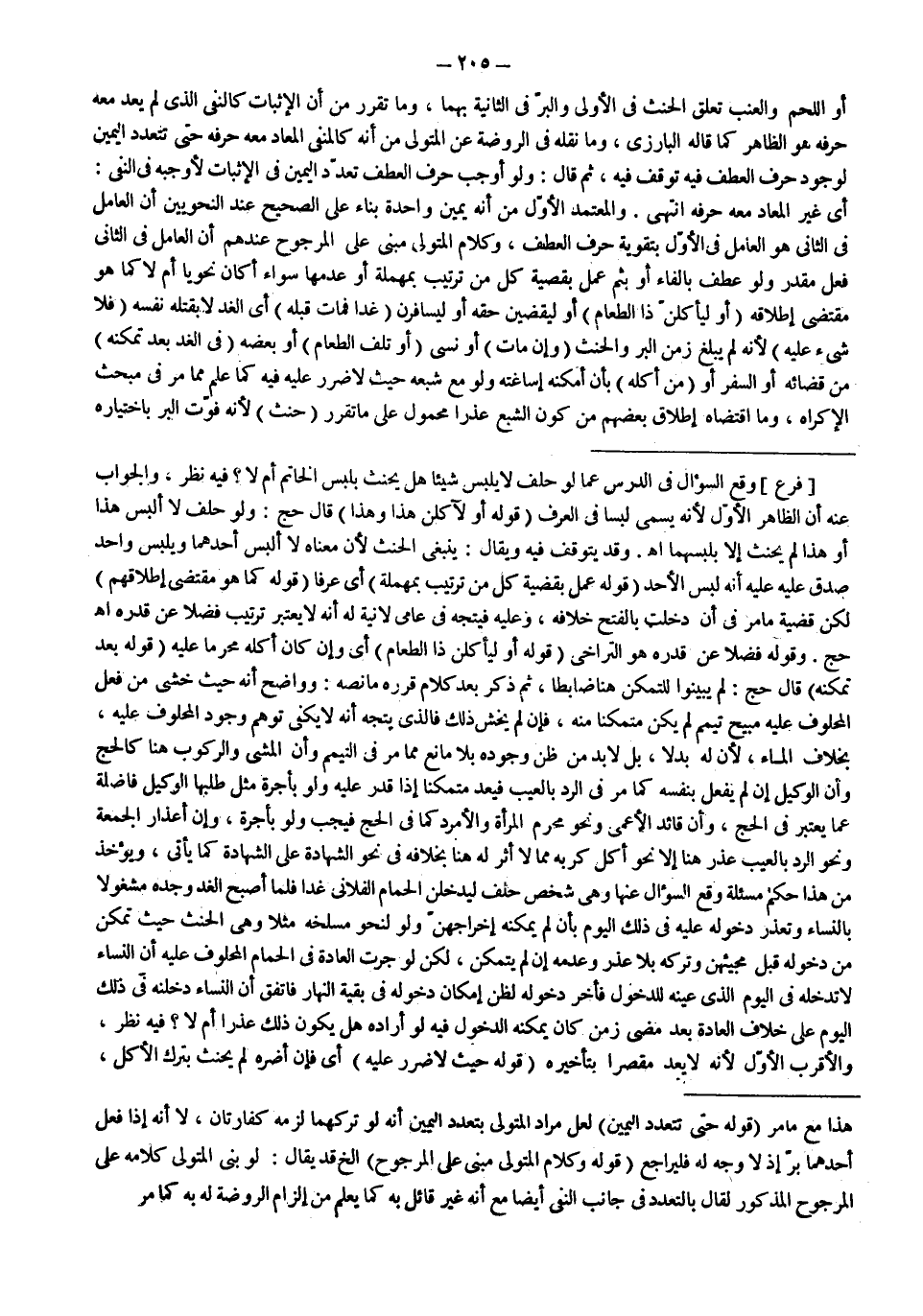 أَوْ اللَّحْمَ وَالْعِنَبَ تَعَلَّقَ الْحِنْثُ فِي الْأُولَى وَالْبِرُّ فِي الثَّانِيَةِ بِهِمَا، وَمَا تَقَرَّرَ مِنْ أَنَّ الْإِثْبَاتَ كَالنَّفْيِ الَّذِي لَمْ يُعِدْ مَعَهُ حَرْفَهُ هُوَ الظَّاهِرُ كَمَا قَالَهُ الْبَارِزِيُّ، وَمَا نَقَلَهُ فِي الرَّوْضَةِ عَنْ الْمُتَوَلِّي مِنْ أَنَّهُ كَالْمَنْفِيِّ الْمَعَادِ مَعَهُ حَرْفُهُ حَتَّى تَتَعَدَّدَ الْيَمِينُ لِوُجُودِ حَرْفِ الْعَطْفِ فِيهِ تَوَقَّفَ فِيهِ، ثُمَّ قَالَ: وَلَوْ أَوْجَبَ حَرْفُ الْعَطْفِ تَعَدُّدَ الْيَمِينِ فِي الْإِثْبَاتِ لَأَوْجَبَهُ فِي النَّفْيِ: أَيْ غَيْرِ الْمَعَادِ مَعَهُ حَرْفُهُ انْتَهَى.