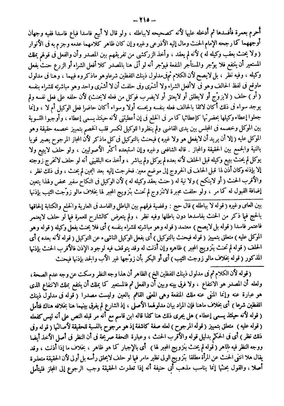 أَحْرَمَ بِعُمْرَةٍ فَأَفْسَدَهَا ثُمَّ أَدْخَلَهُ عَلَيْهَا لِأَنَّهُ كَصَحِيحِهِ لَا بِبَاطِلِهِ، وَلَوْ قَالَ لَا أَبِيعُ فَاسِدًا فَبَاعَ فَاسِدًا فَفِيهِ وَجْهَانِ أَوْجَهُهُمَا كَمَا رَجَّحَهُ الْإِمَامُ الْحِنْثُ وَمَالَ إلَيْهِ الْأَذْرَعِيُّ وَغَيْرُهُ وَإِنْ كَانَ ظَاهِرُ كَلَامِهِمَا عَدَمَهُ وَجَزَمَ بِهِ فِي الْأَنْوَارِ (وَلَا يَحْنَثُ بِعَقْدِ وَكِيلِهِ لَهُ) لِأَنَّهُ لَمْ يَعْقِدْ، وَأَخَذَ الزَّرْكَشِيُّ مِنْ تَفْرِيقِهِمْ بَيْنَ الْمَصْدَرِ وَأَنْ وَالْفِعْلِ فِي قَوْلِهِمْ يَمْلِكُ الْمُسْتَعِيرُ أَنْ يَنْتَفِعَ فَلَا يُؤَجِّرُ وَالْمُسْتَأْجِرُ الْمَنْفَعَةَ فَيُؤَجِّرُ أَنَّهُ لَوْ أَتَى هُنَا بِالْمَصْدَرِ كَلَا أَفْعَلُ الشِّرَاءَ أَوْ الزَّرْعَ حَنِثَ بِفِعْلِ وَكِيلِهِ، وَفِيهِ نَظَرٌ، بَلْ لَا يَصِحُّ لِأَنَّ الْكَلَامَ ثَمَّ فِي مَدْلُولِ ذَيْنِك اللَّفْظَيْنِ شَرْعًا وَهُوَ مَا ذَكَرُوهُ فِيهِمَا، وَهُنَا فِي مَدْلُولِ مَا وَقَعَ فِي لَفْظِ الْحَالِفِ وَهُوَ فِي لَا أَفْعَلُ الشِّرَاءَ وَلَا أَشْتَرِي وَفِي حَلَفْت أَنْ لَا أَشْتَرِي وَاحِدٌ وَهُوَ مُبَاشَرَتُهُ لِلشِّرَاءِ بِنَفْسِهِ.