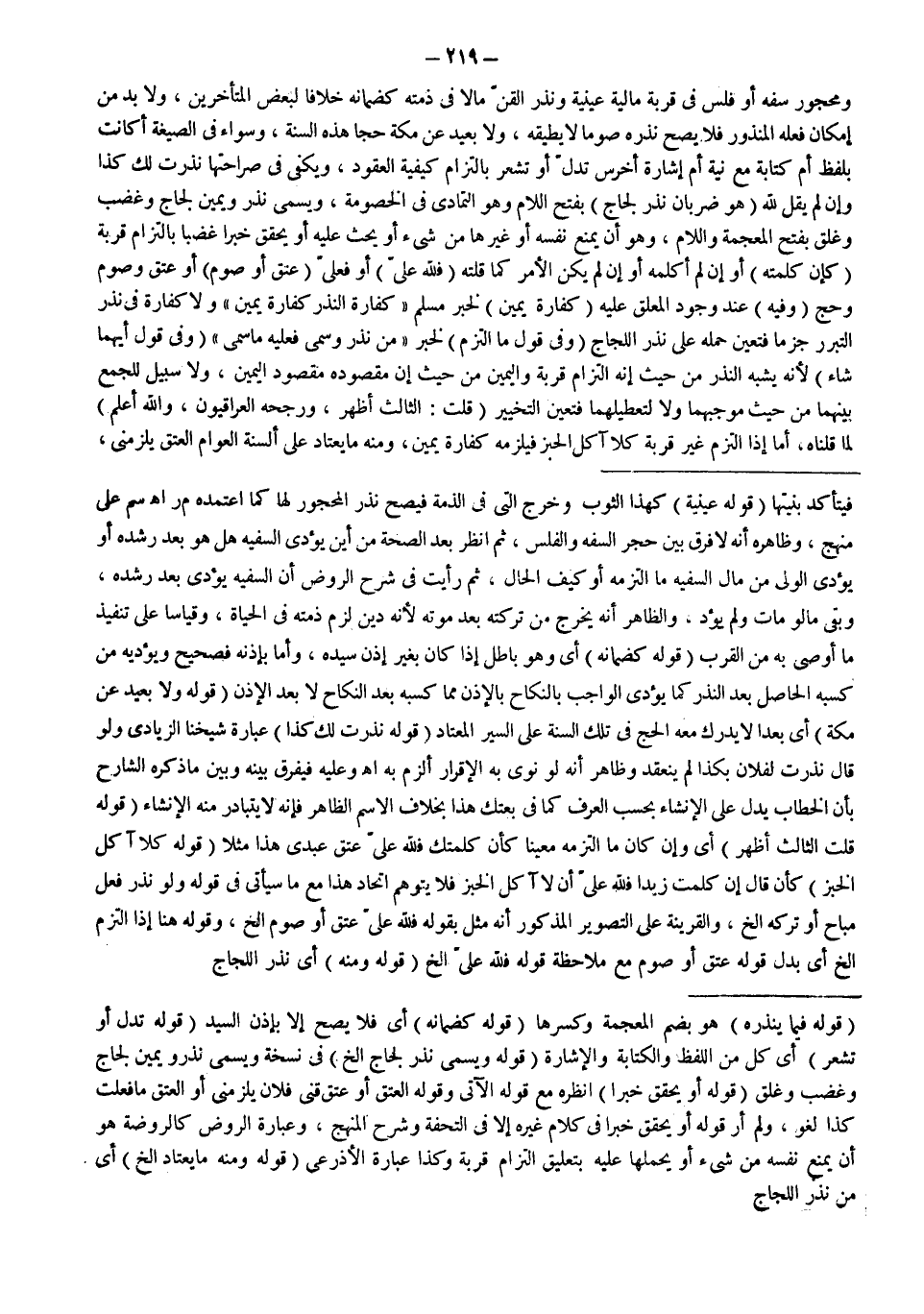 وَمَحْجُورِ سَفَهٍ أَوْ فَلَسٍ فِي قُرْبَةٍ مَالِيَّةٍ عَيْنِيَّةٍ وَنَذْرُ الْقِنِّ مَالًا فِي ذِمَّتِهِ كَضَمَانِهِ خِلَافًا لِبَعْضِ الْمُتَأَخِّرِينَ، وَلَا بُدَّ مِنْ إمْكَانِ فِعْلِهِ الْمَنْذُورَ فَلَا يَصِحُّ نَذْرُهُ صَوْمًا لَا يُطِيقُهُ، وَلَا بَعِيدٍ عَنْ مَكَّةَ حَجًّا هَذِهِ السَّنَةُ، وَسَوَاءٌ فِي الصِّيغَةِ أَكَانَتْ بِلَفْظٍ أَمْ كِتَابَةً مَعَ نِيَّةٍ أَمْ إشَارَةَ أَخْرَسَ تَدُلُّ أَوْ تُشْعِرُ بِالْتِزَامِ كَيْفِيَّةِ الْعُقُودِ، وَيَكْفِي فِي صَرَاحَتِهَا نَذَرْت لَك كَذَا وَإِنْ لَمْ يَقُلْ لِلَّهِ.