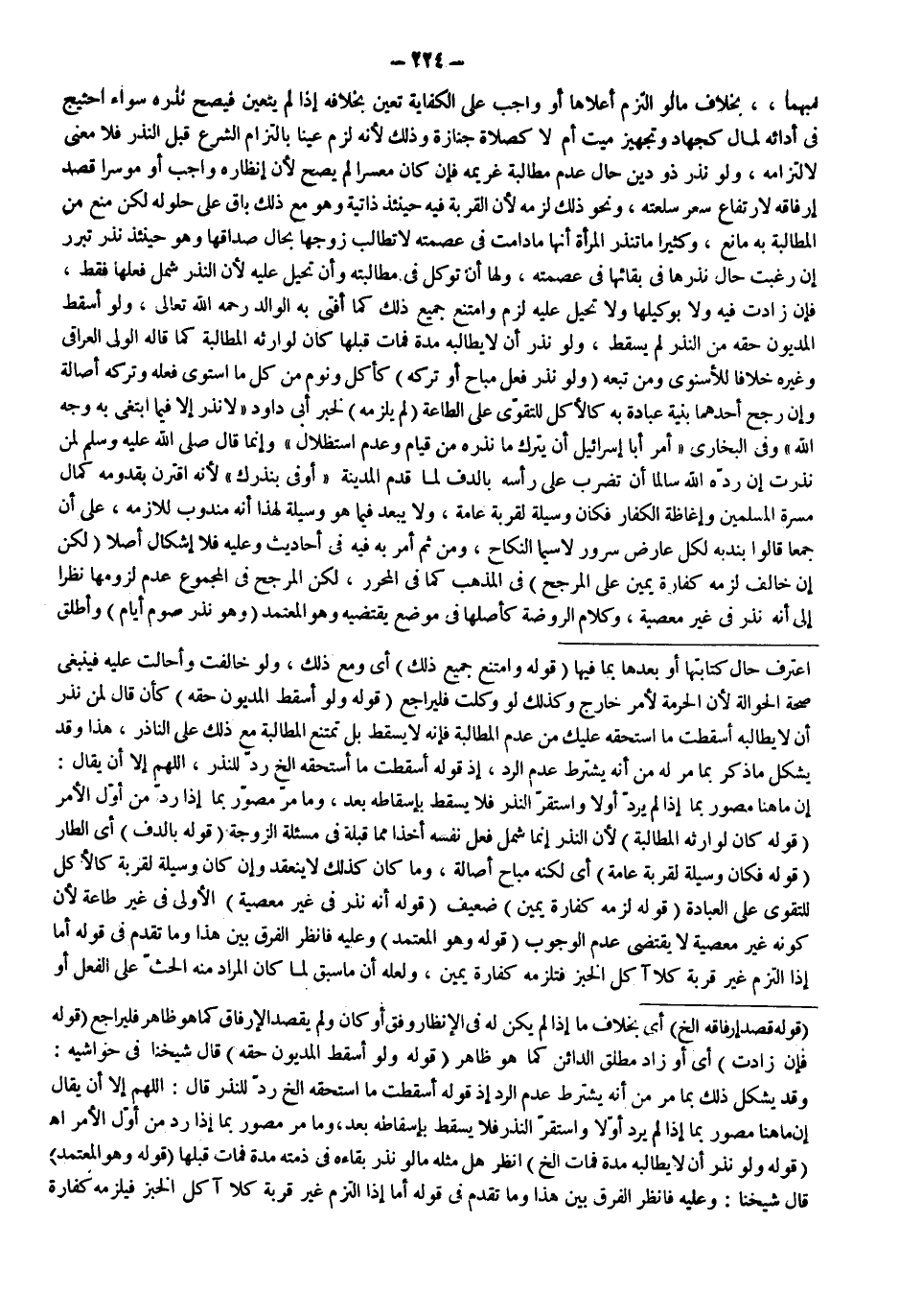 مُبْهَمًا، بِخِلَافِ مَا لَوْ الْتَزَمَ أَعْلَاهَا أَوْ وَاجِبٌ عَلَى الْكِفَايَةِ تَعَيَّنَ بِخِلَافِهِ إذَا لَمْ يَتَعَيَّنْ فَيَصِحُّ نَذْرُهُ سَوَاءٌ اُحْتِيجَ فِي أَدَائِهِ لِمَالٍ كَجِهَادٍ وَتَجْهِيزِ مَيِّتٍ أَمْ لَا كَصَلَاةِ جِنَازَةٍ وَذَلِكَ لِأَنَّهُ لَزِمَ عَيْنًا بِالْتِزَامِ الشَّرْعِ قَبْلَ النَّذْرِ فَلَا مَعْنَى لِالْتِزَامِهِ، وَلَوْ نَذَرَ ذُو دَيْنٍ حَالٍّ عَدَمِ مُطَالَبَةِ غَرِيمِهِ فَإِنْ كَانَ مُعْسِرًا لَمْ يَصِحَّ لِأَنَّ إنْظَارَهُ وَاجِبٌ أَوْ مُوسِرًا قَصَدَ إرْفَاقَهُ لِارْتِفَاعِ سِعْرِ سِلْعَتِهِ، وَنَحْوُ ذَلِكَ لَزِمَهُ لِأَنَّ الْقُرْبَةَ فِيهِ حِينَئِذٍ ذَاتِيَّةٌ وَهُوَ مَعَ ذَلِكَ بَاقٍ عَلَى حُلُولِهِ لَكِنْ مَنَعَ مِنْ الْمُطَالَبَةِ بِهِ مَانِعٌ، وَكَثِيرًا مَا تَنْذِرُ الْمَرْأَةُ أَنَّهَا مَا دَامَتْ فِي عِصْمَتِهِ لَا تُطَالِبُ زَوْجَهَا بِحَالِّ صَدَاقِهَا وَهُوَ حِينَئِذٍ نَذْرُ تَبَرُّرٍ إنْ رَغِبَتْ حَالَ نَذْرِهَا فِي بَقَائِهَا فِي عِصْمَتِهِ، وَلَهَا أَنْ تُوَكِّلَ فِي مُطَالَبَتِهِ وَأَنْ تُحِيلَ عَلَيْهِ لِأَنَّ النَّذْرَ شَمَلَ فِعْلَهَا فَقَطْ، فَإِنْ زَادَتْ فِيهِ وَلَا بِوَكِيلِهَا وَلَا تُحِيلُ عَلَيْهِ لَزِمَ وَامْتَنَعَ جَمِيعُ ذَلِكَ كَمَا أَفْتَى بِهِ الْوَالِدُ - رَحِمَهُ اللَّهُ تَعَالَى -، وَلَوْ أَسْقَطَ الْمَدْيُونُ حَقَّهُ مِنْ النَّذْرِ لَمْ يَسْقُطْ، وَلَوْ نَذَرَ أَنْ لَا يُطَالِبَهُ مُدَّةً فَمَاتَ قَبْلَهَا كَانَ لِوَارِثِهِ الْمُطَالَبَةُ كَمَا قَالَهُ الْوَلِيُّ الْعِرَاقِيُّ وَغَيْرُهُ خِلَافًا لِلْإِسْنَوِيِّ وَمَنْ تَبِعَهُ.