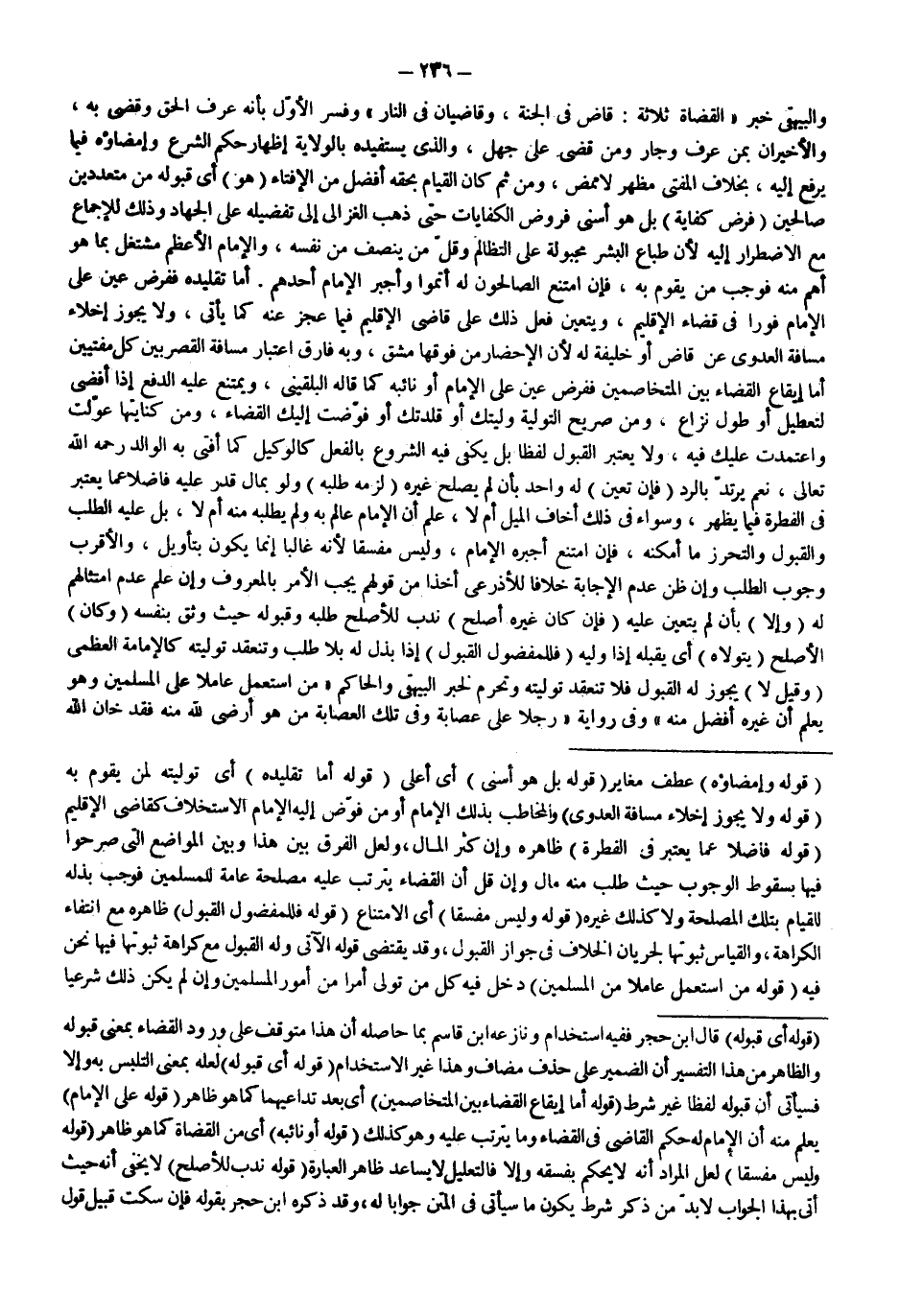 وَالْبَيْهَقِيُّ خَبَرَ «الْقُضَاةُ ثَلَاثَةٌ: قَاضٍ فِي الْجَنَّةِ، وَقَاضِيَانِ فِي النَّارِ» وَفَسَّرَ الْأَوَّلَ بِأَنَّهُ عَرَفَ الْحَقَّ وَقَضَى بِهِ، وَالْأَخِيرَانِ بِمَنْ عَرَفَ وَجَارَ وَمَنْ قَضَى عَلَى جَهْلٍ، وَاَلَّذِي يَسْتَفِيدُهُ بِالْوِلَايَةِ إظْهَارُ حُكْمِ الشَّرْعِ وَإِمْضَاؤُهُ فِيمَا يُرْفَعُ إلَيْهِ، بِخِلَافِ الْمُفْتِي مُظْهِرٌ لَا مُمْضٍ، وَمِنْ ثَمَّ كَانَ الْقِيَامُ بِحَقِّهِ أَفْضَلَ مِنْ الْإِفْتَاءِ (هُوَ) أَيْ قَبُولُهُ مِنْ مُتَعَدِّدِينَ صَالِحِينَ (فَرْضُ كِفَايَةٍ) بَلْ هُوَ أَسْنَى فُرُوضِ الْكِفَايَاتِ حَتَّى ذَهَبَ الْغَزَالِيُّ إلَى تَفْضِيلِهِ عَلَى الْجِهَادِ وَذَلِكَ لِلْإِجْمَاعِ مَعَ الِاضْطِرَارِ إلَيْهِ لِأَنَّ طِبَاعَ الْبَشَرِ مَجْبُولَةٌ عَلَى التَّظَالُمِ وَقَلَّ مَنْ يُنْصِفُ مِنْ نَفْسِهِ، وَالْإِمَامُ الْأَعْظَمُ مُشْتَغِلٌ بِمَا هُوَ أَهَمُّ مِنْهُ فَوَجَبَ مَنْ يَقُومُ بِهِ، فَإِنْ امْتَنَعَ الصَّالِحُونَ لَهُ أَثِمُوا وَأَجْبَرَ الْإِمَامُ أَحَدَهُمْ.