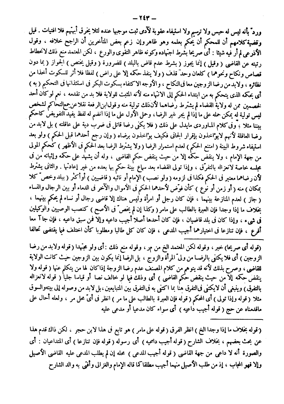 ـــــــــــــــــــــــــــــSقَوْلُهُ: أَيْ صَرِيحًا) خَبَرٌ، وَقَوْلُهُ لَكِنْ الْمُعْتَمَدُ إلَخْ مِنْ م ر، وَقَوْلُهُ مُنِعَ ذَلِكَ: أَيْ وَلَوْ مُجْتَهِدًا (قَوْلُهُ: وَلَا بُدَّ مِنْ رِضَا الزَّوْجَيْنِ) أَيْ فَلَا يَكْتَفِي بِالرِّضَا مِنْ وَلِيِّ الْمَرْأَةِ وَالزَّوْجِ، بَلْ الرِّضَا إنَّمَا يَكُونُ بَيْنَ الزَّوْجَيْنِ حَيْثُ كَانَتْ الْوِلَايَةُ لِلْقَاضِي، وَصَرَّحَ بِذَلِكَ لِأَنَّهُ قَدْ يُتَوَهَّمُ مِنْ كَلَامِ الْمُصَنِّفِ عَدَمُ رِضَا الزَّوْجَةِ إذَا كَانَ لَهَا مَنْ يَتَكَلَّمُ عَنْهَا (قَوْلُهُ وَلَا يُنْقَضُ حُكْمُهُ إلَّا مِنْ حَيْثُ يُنْقَضُ حُكْمُ الْقَاضِي) أَيْ وَذَلِكَ فِيمَا لَوْ خَالَفَ نَصًّا أَوْ قِيَاسًا جَلِيًّا (قَوْلُهُ: لِانْعِزَالِهِ بِالتَّفَرُّقِ) وَيَنْبَغِي أَنْ لَا يَكْتَفِي فِي التَّفَرُّقِ هُنَا بِمَا اكْتَفَى بِهِ فِي التَّفَرُّقِ بَيْنَ الْمُتَبَايِعَيْنِ، بَلْ لَا بُدَّ مِنْ وُصُولِهِ إلَى بَيْتِهِ وَالسُّوقِ مَثَلًا (قَوْلُهُ: وَإِذَا تَوَلَّى) أَيْ الْمُحَكَّمُ.