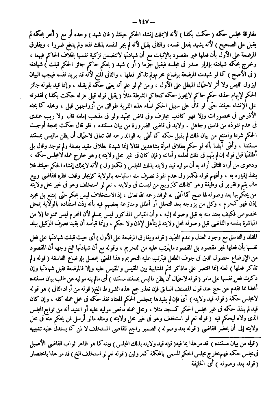مُفَارَقَةِ مَجْلِسِ حُكْمِهِ (حَكَمْت بِكَذَا) لِأَنَّهُ لَا يَمْلِكُ إنْشَاءَ الْحُكْمِ حِينَئِذٍ (فَإِنْ شَهِدَ) وَحْدَهُ أَوْ مَعَ (آخَرَ بِحُكْمِهِ لَمْ يُقْبَلْ عَلَى الصَّحِيحِ) لِأَنَّهُ يَشْهَدُ بِفِعْلِ نَفْسِهِ، وَالثَّانِي يُقْبَلُ لِأَنَّهُ لَمْ يَجُرَّ لِنَفْسِهِ بِذَلِكَ نَفْعًا وَلَمْ يَدْفَعْ ضَرَرًا، وَيُفَارِقُ الْمُرْضِعَةَ عَلَى الْأَوَّلِ بِأَنَّ فِعْلَهَا غَيْرُ مَقْصُودٍ بِالْإِثْبَاتِ مَعَ أَنَّ شَهَادَتَهَا لَا تَتَضَمَّنُ تَزْكِيَةَ نَفْسِهَا بِخِلَافِ الْحَاكِمِ فِيهِمَا، وَخَرَجَ بِحُكْمِهِ شَهَادَتُهُ بِإِقْرَارٍ صَدَرَ فِي مَجْلِسِهِ فَيُقْبَلُ جَزْمًا (أَوْ) شَهِدَ (بِحُكْمِ حَاكِمٍ جَائِزِ الْحُكْمِ قُبِلَتْ) شَهَادَتُهُ (فِي الْأَصَحِّ) كَمَا لَوْ شَهِدَتْ الْمُرْضِعَةُ بِرَضَاعِ مَحْرَمٍ وَلَمْ تَذْكُرْ فِعْلَهَا، وَالثَّانِي الْمَنْعُ لِأَنَّهُ قَدْ يُرِيدُ نَفْسَهُ فَيَجِبُ الْبَيَانُ لِيَزُولَ اللَّبْسَ وَلَا أَثَرَ لِاحْتِمَالِ الْمُبْطِلِ عَلَى الْأَوَّلِ، وَمِنْ ثَمَّ لَوْ عَلِمَ أَنَّهُ يَعْنِي حُكْمَهُ لَمْ يَقْبَلْهُ، وَإِنَّمَا قَيَّدَ بِقَوْلِهِ جَائِزُ الْحُكْمِ لِإِيهَامِ حَذْفِهِ حُكْمَ حَاكِمٍ لَا يَجُوزُ حُكْمُهُ كَحَاكِمِ الشُّرْطَةِ مَثَلًا (يُقْبَلُ قَوْلُهُ قَبْلَ عَزْلِهِ حَكَمْت بِكَذَا) لِقُدْرَتِهِ عَلَى الْإِنْشَاءِ حِينَئِذٍ حَتَّى لَوْ قَالَ عَلَى سَبِيلِ الْحُكْمِ نِسَاءُ هَذِهِ الْقَرْيَةِ طَوَالِقُ مِنْ أَزْوَاجِهِنَّ قُبِلَ، وَمَحَلُّهُ كَمَا بَحَثَهُ الْأَذْرَعِيُّ فِي مَحْصُورَاتٍ وَإِلَّا فَهُوَ كَاذِبٌ مُجَازِفٌ وَفِي قَاضٍ مُجْتَهِدٍ وَلَوْ فِي مَذْهَبِ إمَامِهِ قَالَ وَلَا رَيْبَ عِنْدِي فِي عَدَمِ نُفُوذِهِ مِنْ فَاسِقٍ وَجَاهِلٍ، وَلَا بُدَّ فِي قَاضِي الضَّرُورَةِ مِنْ بَيَانِ مُسْتَنَدِهِ، فَلَوْ قَالَ حَكَمْت بِحُجَّةٍ أَوْجَبَتْ الْحُكْمَ شَرْعًا وَامْتَنَعَ مِنْ بَيَانِ ذَلِكَ لَمْ يُقْبَلْ حُكْمُهُ كَمَا أَفْتَى بِهِ الْوَالِدُ - رَحِمَهُ اللَّهُ تَعَالَى - لِاحْتِمَالِ أَنْ يَظُنَّ مَا لَيْسَ بِمُسْتَنَدٍ مُسْتَنَدًا، وَأَفْتَى أَيْضًا بِأَنَّهُ لَوْ حَكَمَ بِطَلَاقِ امْرَأَةٍ بِشَاهِدَيْنِ فَقَالَا إنَّمَا شَهِدْنَا بِطَلَاقٍ مُقَيَّدٍ بِصِفَةٍ وَلَمْ تُوجَدْ وَقَالَ بَلْ أَطْلَقْتُمَا قُبِلَ قَوْلُهُ إنْ لَمْ يُتَّهَمْ فِي ذَلِكَ لِعِلْمِهِ وَأَمَانَتِهِ (فَإِنْ كَانَ فِي غَيْرِ مَحَلِّ وِلَايَتِهِ) وَهُوَ خَارِجُ عَمَلِهِ لَا مَجْلِسِ حُكْمِهِ، وَدَعْوَى مَنْ أَرَادَ الثَّانِي أَرَادَ بِهِ أَنَّ مُوَلِّيَهُ قَيَّدَ وِلَايَتَهُ بِذَلِكَ الْمَجْلِسِ (فَكَمَعْزُولٍ) لِأَنَّهُ لَا يَمْلِكُ إنْشَاءَ الْحُكْمِ حِينَئِذٍ فَلَا يَنْفُذُ إقْرَارُهُ بِهِ، وَأَفْهَمَ قَوْلُهُ فَكَمَعْزُولٍ عَدَمَ نُفُوذِ تَصَرُّفٍ مِنْهُ اسْتَبَاحَهُ بِالْوِلَايَةِ كَإِيجَارِ وَقْفٍ نَظَرُهُ لِلْقَاضِي وَبَيْعِ مَالِ يَتِيمٍ وَتَقْرِيرٍ فِي وَظِيفَةٍ وَهُوَ كَذَلِكَ كَتَزْوِيجِ مَنْ لَيْسَتْ فِي وِلَايَتِهِ، نَعَمْ لَوْ اسْتَخْلَفَ وَهُوَ فِي غَيْرِ مَحَلِّ وِلَايَتِهِ مَنْ يَحْكُمُ بِهَا بَعْدَ وُصُولِهِ لَهَا صَحَّ كَمَا أَفْتَى بِهِ الْوَالِدُ - رَحِمَهُ اللَّهُ تَعَالَى -، إذْ الِاسْتِخْلَافُ لَيْسَ بِحُكْمٍ حَتَّى يَمْتَنِعَ بَلْ مُجَرَّدُ إذْنٍ فَهُوَ كَمَحْرَمٍ، وَكُلُّ مَنْ يُزَوِّجُهُ بَعْدَ التَّحَلُّلِ أَوْ أَطْلَقَ وَمُنَازَعَةُ بَعْضِهِمْ.