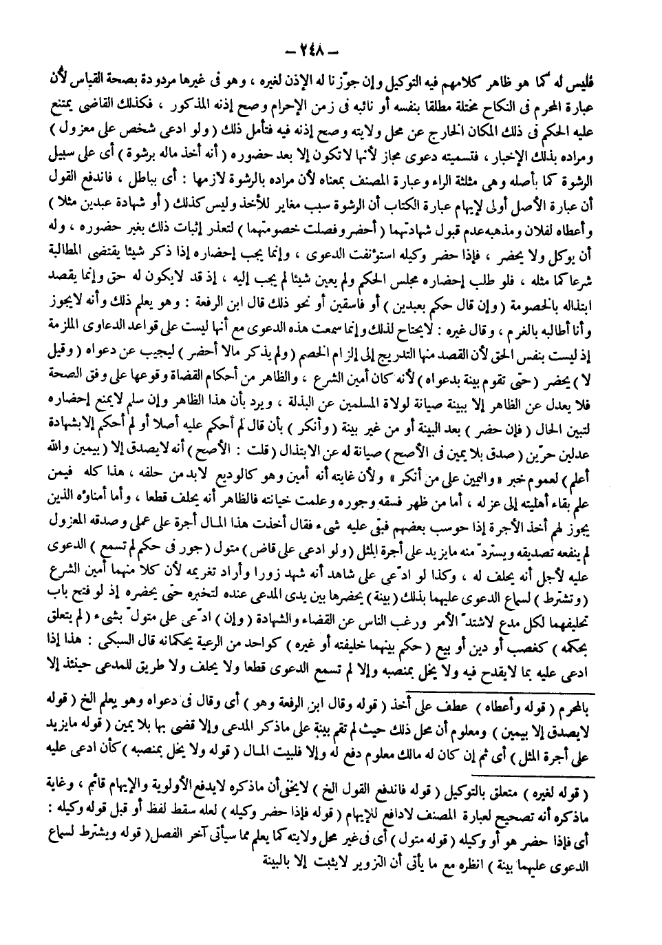 فَلَيْسَ لَهُ كَمَا هُوَ ظَاهِرُ كَلَامِهِمْ فِيهِ التَّوْكِيلُ وَإِنْ جَوَّزْنَا لَهُ الْإِذْنَ لِغَيْرِهِ، وَهُوَ فِي غَيْرِهَا مَرْدُودَةٌ بِصِحَّةِ الْقِيَاسِ لِأَنَّ عِبَارَةَ الْمَحْرَمِ فِي النِّكَاحِ مُخْتَلَّةٌ مُطْلَقًا بِنَفْسِهِ أَوْ نَائِبِهِ فِي زَمَنِ الْإِحْرَامِ وَصَحَّ إذْنُهُ الْمَذْكُورُ، فَكَذَلِكَ الْقَاضِي يَمْتَنِعُ عَلَيْهِ الْحُكْمُ فِي ذَلِكَ الْمَكَانِ الْخَارِجِ عَنْ مَحَلِّ وِلَايَتِهِ وَصَحَّ إذْنُهُ فِيهِ فَتَأَمَّلْ ذَلِكَ.