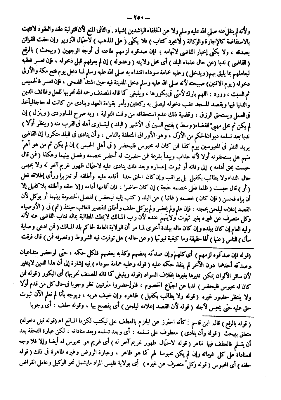 ـــــــــــــــــــــــــــــSقَوْلُهُ: فَإِنْ صَدَّقُوهُ لَزِمَهُمْ) أَيْ كُلَّهُمْ وَإِنْ صَدَّقَهُ بَعْضُهُمْ وَكَذَّبَهُ بَعْضُهُمْ فَلِكُلٍّ حُكْمُهُ، حَتَّى لَوْ حَضَرَ مُتَدَاعِيَانِ وَصَدَّقَهُ أَحَدُهُمَا دُونَ الْآخَرِ لَمْ يَنْفُذْ حُكْمُهُ عَلَيْهِ (قَوْلُهُ وَعَلَيْهِ عِمَامَةٌ سَوْدَاءُ) فِيهِ إشَارَةٌ إلَى أَنَّ هَذَا الدِّينَ لَا يَتَغَيَّرُ لِأَنَّ سَائِرَ الْأَلْوَانِ يُمْكِنُ تَغَيُّرُهَا بِغَيْرِهَا بِخِلَافِ السَّوَادِ (قَوْلُهُ: وَيَنْبَغِي كَمَا قَالَهُ الْمُصَنِّفُ تَحَرِّيهَا) أَيْ الْبُكُورِ (قَوْلُهُ: فَمَنْ كَانَ لَهُ مَحْبُوسٌ فَلْيَحْضُرْ) نَدْبًا عَنْ اجْتِمَاعِ الْخُصُومِ، فَلَوْ حَضَرُوا مُتَرَتِّبِينَ نَظَرَ وُجُوبًا فِي حَالِ كُلِّ مَنْ قَدِمَ أَوَّلًا وَلَا يَنْتَظِرُ حُضُورَ غَيْرِهِ (قَوْلُهُ: وَلَا يُطَالَبُ بِكَفِيلٍ) ظَاهِرُهُ وَإِنْ خِيفَ هَرَبُهُ، وَيُوَجَّهُ بِأَنَّا لَمْ نَعْلَمْ الْآنَ ثُبُوتَ حَقٍّ عَلَيْهِ حَتَّى يُحْبَسَ لِأَجْلِهِ (قَوْلُهُ: لِأَنَّ الْقَصْدَ إعْلَامُهُ لِيَلْحَنَ) أَيْ يُفْصِحَ بِهَا، وَقَوْلُهُ حَلَفَ: أَيْ وُجُوبًا