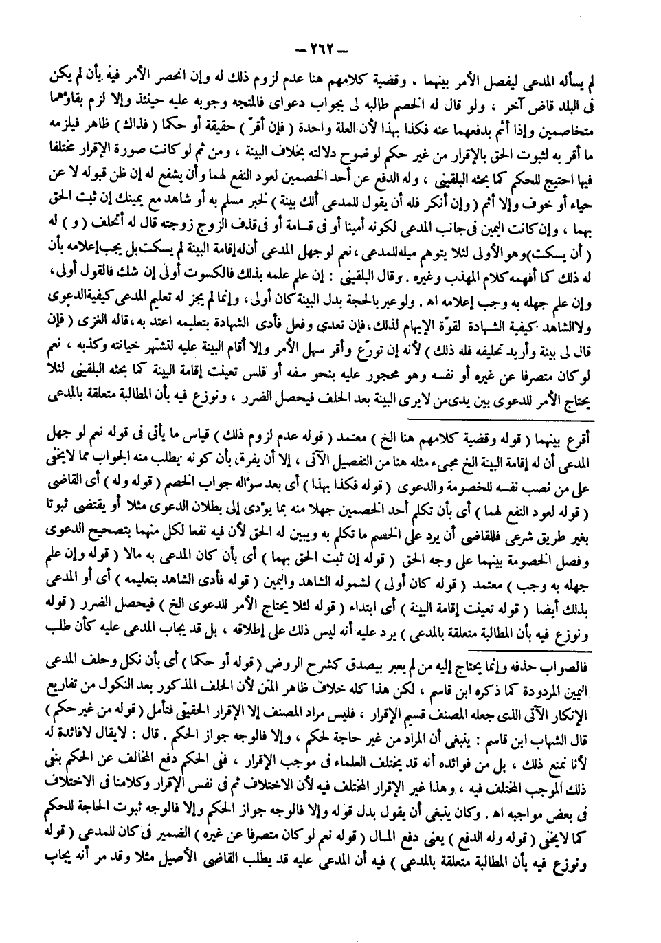لَمْ يَسْأَلْهُ الْمُدَّعِي لِيَفْصِلَ الْأَمْرَ بَيْنَهُمَا، وَقَضِيَّةُ كَلَامِهِمْ هُنَا عَدَمُ لُزُومِ ذَلِكَ لَهُ وَإِنْ انْحَصَرَ الْأَمْرُ فِيهِ بِأَنْ لَمْ يَكُنْ فِي الْبَلَدِ قَاضٍ آخَرُ، وَلَوْ قَالَ لَهُ الْخَصْمُ طَالِبْهُ لِي بِجَوَابِ دَعْوَايَ فَالْمُتَّجَهُ وُجُوبُهُ عَلَيْهِ حِينَئِذٍ وَإِلَّا لَزِمَ بَقَاؤُهُمَا مُتَخَاصِمَيْنِ وَإِذًا أَثِمَ بِدَفْعِهِمَا عَنْهُ فَكَذَا بِهَذَا لِأَنَّ الْعِلَّةَ وَاحِدَةٌ (فَإِنْ أَقَرَّ) حَقِيقَةً أَوْ حُكْمًا (فَذَاكَ) ظَاهِرٌ فَيَلْزَمُهُ مَا أَقَرَّ بِهِ لِثُبُوتِ الْحَقِّ بِالْإِقْرَارِ مِنْ غَيْرِ حُكْمٍ لِوُضُوحِ دَلَالَتِهِ بِخِلَافِ الْبَيِّنَةِ، وَمِنْ ثَمَّ لَوْ كَانَتْ صُورَةُ الْإِقْرَارِ مُخْتَلَفًا فِيهَا اُحْتِيجَ لِلْحُكْمِ كَمَا بَحَثَهُ الْبُلْقِينِيُّ، وَلَهُ الدَّفْعُ عَنْ أَحَدِ الْخَصْمَيْنِ لِعَوْدِ النَّفْعِ لَهُمَا وَأَنْ يَشْفَعَ لَهُ إنْ ظَنَّ قَبُولَهُ لَا عَنْ حَيَاءٍ أَوْ خَوْفٍ وَإِلَّا أَثِمَ (وَإِنْ أَنْكَرَ فَلَهُ أَنْ يَقُولَ لِلْمُدَّعِي أَلَك بَيِّنَةٌ) لِخَبَرٍ مُسَلَّمٍ بِهِ أَوْ شَاهِدٍ مَعَ يَمِينِك إنْ ثَبَتَ الْحَقُّ بِهِمَا، وَإِنْ كَانَتْ الْيَمِينُ فِي جَانِبِ الْمُدَّعِي لِكَوْنِهِ أَمِينًا أَوْ فِي قَسَامَةٍ أَوْ فِي قَذْفِ الزَّوْجِ زَوْجَتَهُ قَالَ لَهُ أَتَحْلِفُ (وَ) لَهُ (أَنْ يَسْكُتَ) وَهُوَ الْأَوْلَى لِئَلَّا يُتَوَهَّمَ مَيْلُهُ لِلْمُدَّعِي، نَعَمْ لَوْ جَهِلَ الْمُدَّعِي أَنَّ لَهُ إقَامَةَ الْبَيِّنَةِ لَمْ يَسْكُتْ بَلْ يَجِبُ إعْلَامُهُ بِأَنَّ لَهُ ذَلِكَ كَمَا أَفْهَمَهُ كَلَامُ الْمُهَذَّبِ وَغَيْرِهِ. وَقَالَ الْبُلْقِينِيُّ: إنْ عَلِمَ عِلْمَهُ بِذَلِكَ فَالسُّكُوتُ أَوْلَى إنْ شَكَّ فَالْقَوْلُ أَوْلَى، وَإِنْ عَلِمَ جَهْلَهُ بِهِ وَجَبَ إعْلَامُهُ اهـ. وَلَوْ عَبَّرَ بِالْحُجَّةِ بَدَلَ الْبَيِّنَةِ كَانَ أَوْلَى، وَإِنَّمَا لَمْ يَجُزْ لَهُ تَعْلِيمُ الْمُدَّعِي كَيْفِيَّةَ الدَّعْوَى وَلَا الشَّاهِدِ كَيْفِيَّةَ الشَّهَادَةِ لِقُوَّةِ الْإِيهَامِ لِذَلِكَ، فَإِنْ تَعَدَّى وَفَعَلَ فَأَدَّى الشَّهَادَةَ بِتَعْلِيمِهِ اُعْتُدَّ بِهِ، قَالَهُ الْغَزِّيِّ