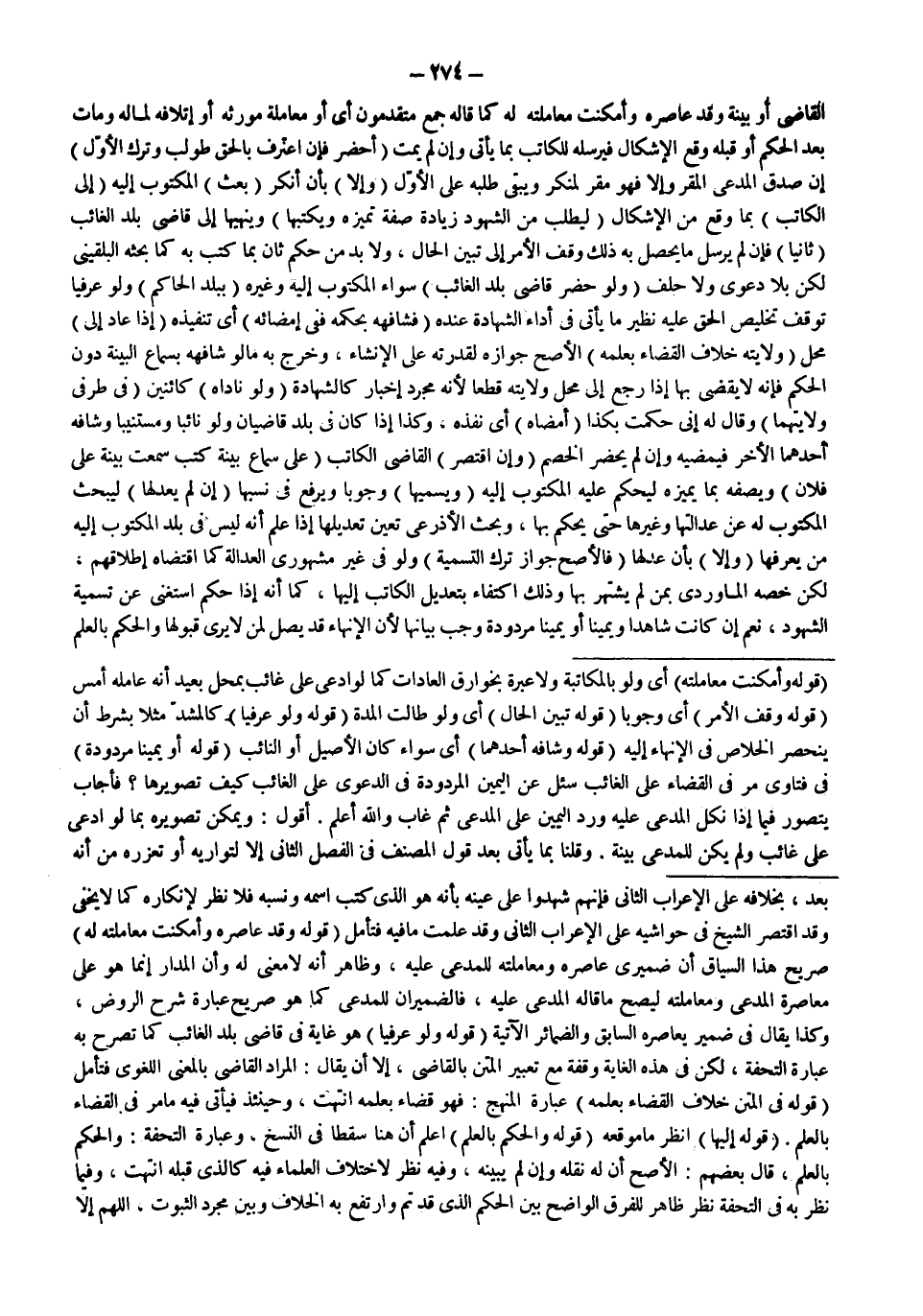 ـــــــــــــــــــــــــــــQبَعْدُ، بِخِلَافِهِ عَلَى الْإِعْرَابِ الثَّانِي فَإِنَّهُمْ شَهِدُوا عَلَى عَيْنِهِ بِأَنَّهُ هُوَ الَّذِي كَتَبَ اسْمَهُ وَنَسَبَهُ فَلَا نَظَرَ لِإِنْكَارِهِ كَمَا لَا يَخْفَى وَقَدْ اقْتَصَرَ الشَّيْخُ فِي حَوَاشِيهِ عَلَى الْإِعْرَابِ الثَّانِي وَقَدْ عَلِمْت مَا فِيهِ فَتَأَمَّلْ (قَوْلُهُ: وَقَدْ عَاصَرَهُ وَأَمْكَنَتْ مُعَامَلَتُهُ لَهُ) صَرِيحُ هَذَا السِّيَاقِ أَنَّ ضَمِيرَيْ عَاصَرَهُ وَمُعَامَلَتُهُ لِلْمُدَّعَى عَلَيْهِ، وَظَاهِرٌ أَنَّهُ لَا مَعْنَى لَهُ وَأَنَّ الْمَدَارَ إنَّمَا هُوَ عَلَى مُعَاصَرَةِ الْمُدَّعِي وَمُعَامَلَتِهِ لِيَصِحَّ مَا قَالَهُ الْمُدَّعَى عَلَيْهِ، فَالضَّمِيرَانِ لِلْمُدَّعِي كَمَا هُوَ صَرِيحُ عِبَارَةِ شَرْحِ الرَّوْضِ، وَكَذَا يُقَالُ فِي ضَمِيرِ يُعَاصِرُهُ السَّابِقِ وَالضَّمَائِرِ الْآتِيَةِ (قَوْلُهُ: وَلَوْ عُرْفِيًّا) هُوَ غَايَةٌ فِي قَاضِي بَلَدِ الْغَائِبِ كَمَا تُصَرِّحُ بِهِ عِبَارَةُ التُّحْفَةِ، لَكِنْ فِي هَذِهِ الْغَايَةِ وَقْفَةٌ مَعَ تَعْبِيرِ الْمَتْنِ بِالْقَاضِي، إلَّا أَنْ يُقَالَ: الْمُرَادُ الْقَاضِي بِالْمَعْنَى اللُّغَوِيِّ فَتَأَمَّلْ (قَوْلُهُ: فِي الْمَتْنِ خِلَافُ الْقَضَاءِ بِعِلْمِهِ) عِبَارَةُ الْمَنْهَجِ: فَهُوَ قَضَاءٌ بِعِلْمِهِ انْتَهَتْ، وَحِينَئِذٍ فَيَأْتِي فِيهِ مَا مَرَّ فِي الْقَضَاءِ بِالْعِلْمِ. (قَوْلُهُ: إلَيْهَا) اُنْظُرْ مَا مَوْقِعُهُ (قَوْلُهُ: وَالْحُكْمُ بِالْعِلْمِ) اعْلَمْ أَنَّ هُنَا سَقْطًا فِي النَّسْخِ، وَعِبَارَةُ التُّحْفَةِ: وَالْحُكْمُ بِالْعِلْمِ، قَالَ بَعْضُهُمْ: الْأَصَحُّ أَنَّ لَهُ نَقْلَهُ وَإِنْ لَمْ يُبَيِّنْهُ، وَفِيهِ نَظَرٌ لِاخْتِلَافِ الْعُلَمَاءِ فِيهِ كَاَلَّذِي قَبْلَهُ انْتَهَتْ، وَفِيمَا نَظَرَ بِهِ فِي التُّحْفَةِ نَظَرٌ ظَاهِرٌ لِلْفَرْقِ الْوَاضِحِ بَيْنَ الْحُكْمِ الَّذِي قَدْ تَمَّ وَارْتَفَعَ بِهِ الْخِلَافُ وَبَيْنَ مُجَرَّدِ الثُّبُوتِ، اللَّهُمَّ إلَّا