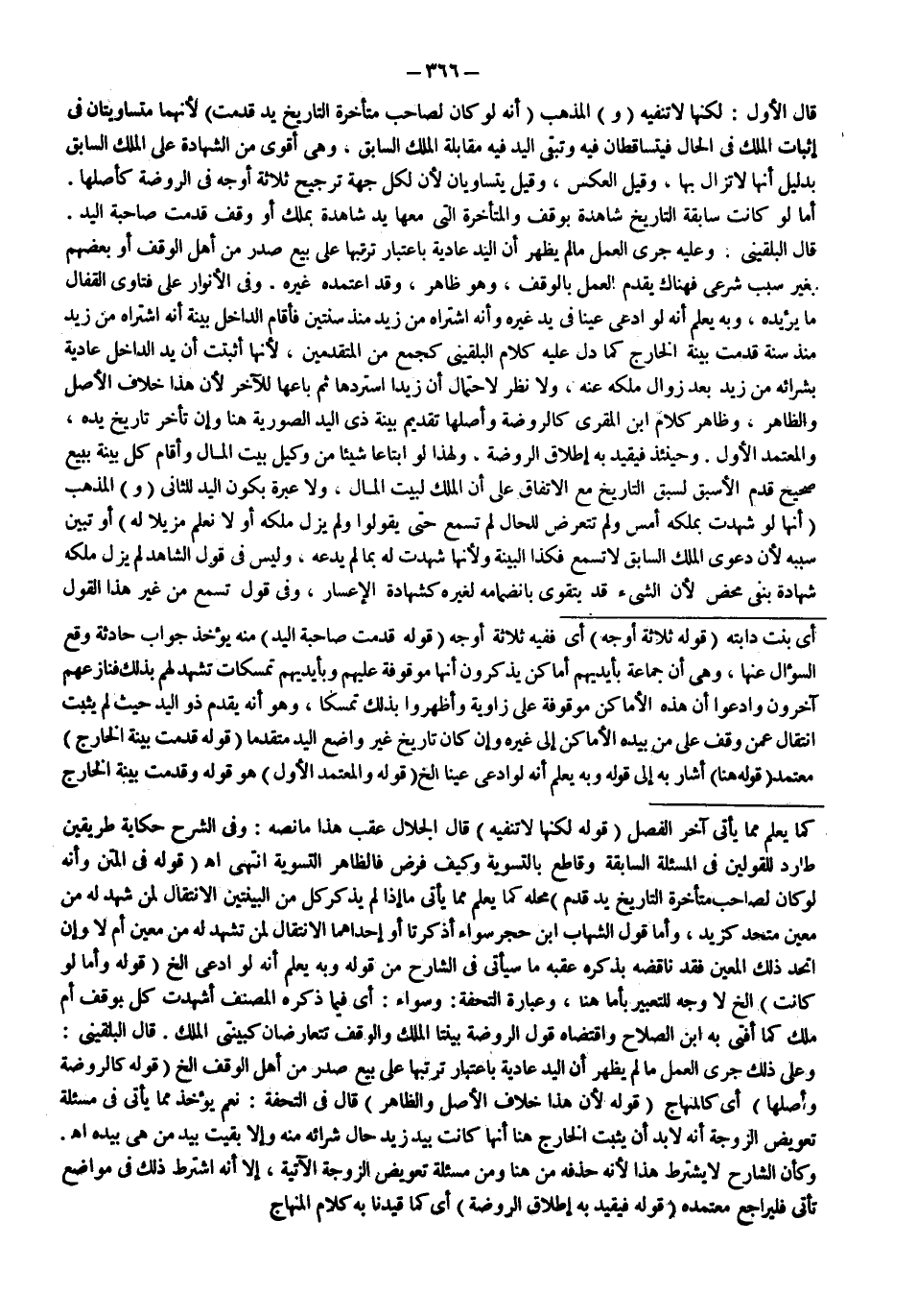 قَالَ الْأَوَّلُ: لَكِنَّهَا لَا تَنْفِيهِ (وَ) الْمَذْهَبُ (أَنَّهُ لَوْ كَانَ لِصَاحِبِ مُتَأَخِّرَةِ التَّارِيخِ يَدٌ قُدِّمَتْ) لِأَنَّهُمَا مُتَسَاوِيَتَانِ فِي إثْبَاتِ الْمِلْكِ فِي الْحَالِّ فَيَتَسَاقَطَانِ فِيهِ وَتَبْقَى الْيَدُ فِيهِ مُقَابِلَةَ الْمِلْكِ السَّابِقِ، وَهِيَ أَقْوَى مِنْ الشَّهَادَةِ عَلَى الْمِلْكِ السَّابِقِ بِدَلِيلِ أَنَّهَا لَا تَزَالُ بِهَا، وَقِيلَ الْعَكْسُ، وَقِيلَ: يَتَسَاوَيَانِ لِأَنَّ لِكُلِّ جِهَةٍ تَرْجِيحَ ثَلَاثَةِ أَوْجُهٍ فِي الرَّوْضَةِ كَأَصْلِهَا أَمَّا لَوْ كَانَتْ سَابِقَةُ التَّارِيخِ شَاهِدَةً بِوَقْفٍ وَالْمُتَأَخِّرَةُ الَّتِي مَعَهَا يَدٌ شَاهِدَةً بِمِلْكٍ أَوْ وَقْفٍ قُدِّمَتْ صَاحِبَةُ الْيَدِ قَالَ الْبُلْقِينِيُّ: وَعَلَيْهِ جَرَى الْعَمَلُ مَا لَمْ يَظْهَرْ أَنَّ الْيَدَ عَادِيَةٌ بِاعْتِبَارِ تَرَتُّبِهَا عَلَى بَيْعٍ صَدَرَ مِنْ أَهْلِ الْوَقْفِ أَوْ بَعْضِهِمْ بِغَيْرِ سَبَبٍ شَرْعِيٍّ فَهُنَاكَ يُقَدَّمُ الْعَمَلُ بِالْوَقْفِ، وَهُوَ ظَاهِرٌ، وَقَدْ اعْتَمَدَهُ غَيْرُهُ. .