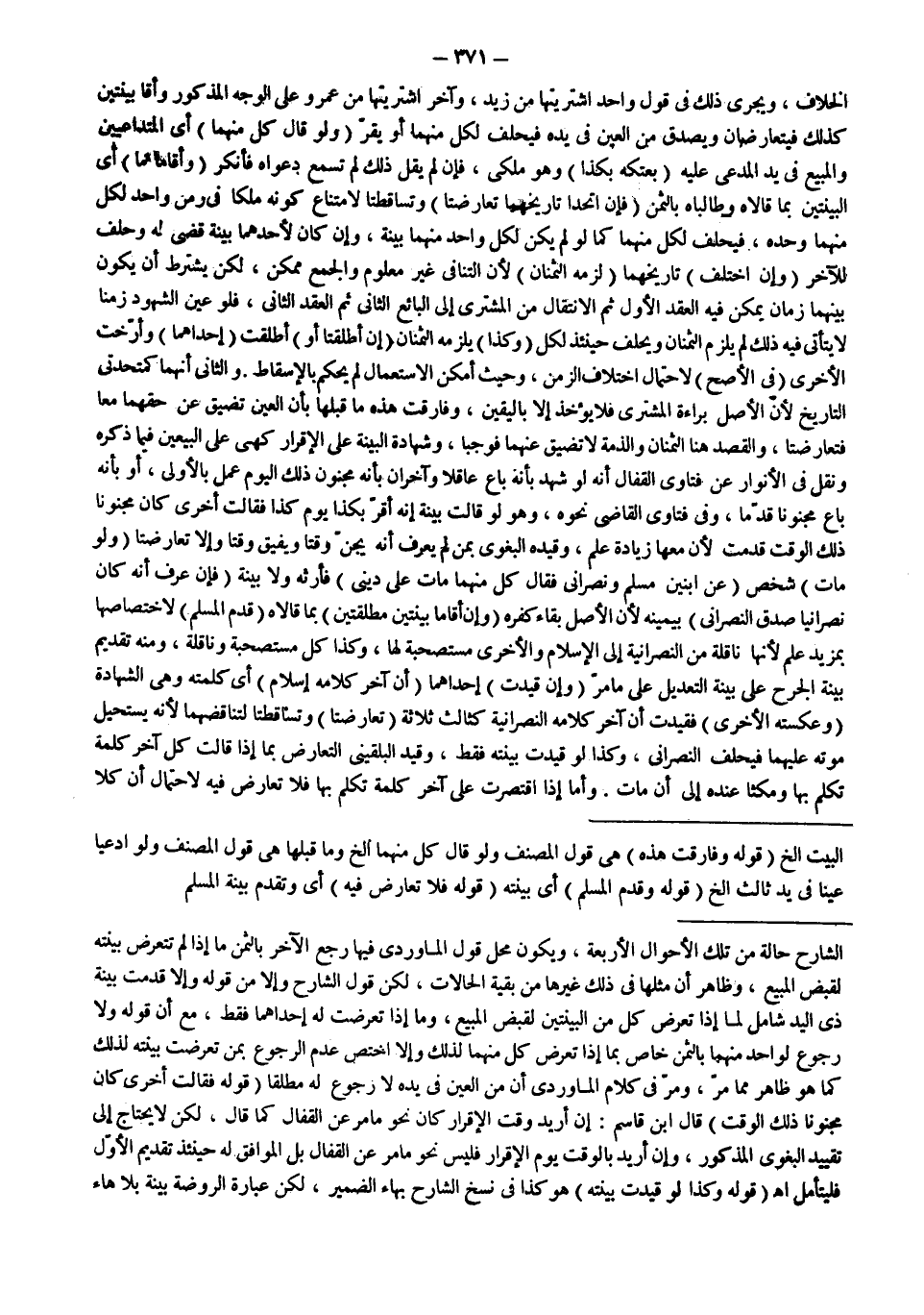 ـــــــــــــــــــــــــــــQالشَّارِحُ حَالَةٌ مِنْ تِلْكَ الْأَحْوَالِ الْأَرْبَعَةِ، وَيَكُونُ مَحَلُّ قَوْلِ الْمَاوَرْدِيِّ فِيهَا رَجَعَ الْآخَرُ بِالثَّمَنِ مَا إذَا لَمْ تَتَعَرَّضْ بَيِّنَتُهُ لِقَبْضِ الْمَبِيعِ، وَظَاهِرٌ أَنَّ مِثْلَهَا فِي ذَلِكَ غَيْرُهَا مِنْ بَقِيَّةِ الْحَالَاتِ، لَكِنَّ قَوْلَ الشَّارِحِ وَإِلَّا مِنْ قَوْلِهِ وَإِلَّا قُدِّمَتْ بَيِّنَةُ ذِي الْيَدِ شَامِلٌ لِمَا إذَا تَعَرَّضَ كُلٌّ مِنْ الْبَيِّنَتَيْنِ لِقَبْضِ الْمَبِيعِ، وَمَا إذَا تَعَرَّضَتْ لَهُ إحْدَاهُمَا فَقَطْ، مَعَ أَنَّ قَوْلَهُ وَلَا رُجُوعَ لِوَاحِدٍ مِنْهُمَا بِالثَّمَنِ خَاصٌّ بِمَا إذَا تَعَرَّضَ كُلٌّ مِنْهُمَا لِذَلِكَ وَإِلَّا اُخْتُصَّ عَدَمُ الرُّجُوعِ بِمَنْ تَعَرَّضَتْ بَيِّنَتُهُ لِذَلِكَ كَمَا هُوَ ظَاهِرٌ مِمَّا مَرَّ، وَمَرَّ فِي كَلَامِ الْمَاوَرْدِيِّ أَنَّ مَنْ الْعَيْنُ فِي يَدِهِ لَا رُجُوعَ لَهُ مُطْلَقًا
