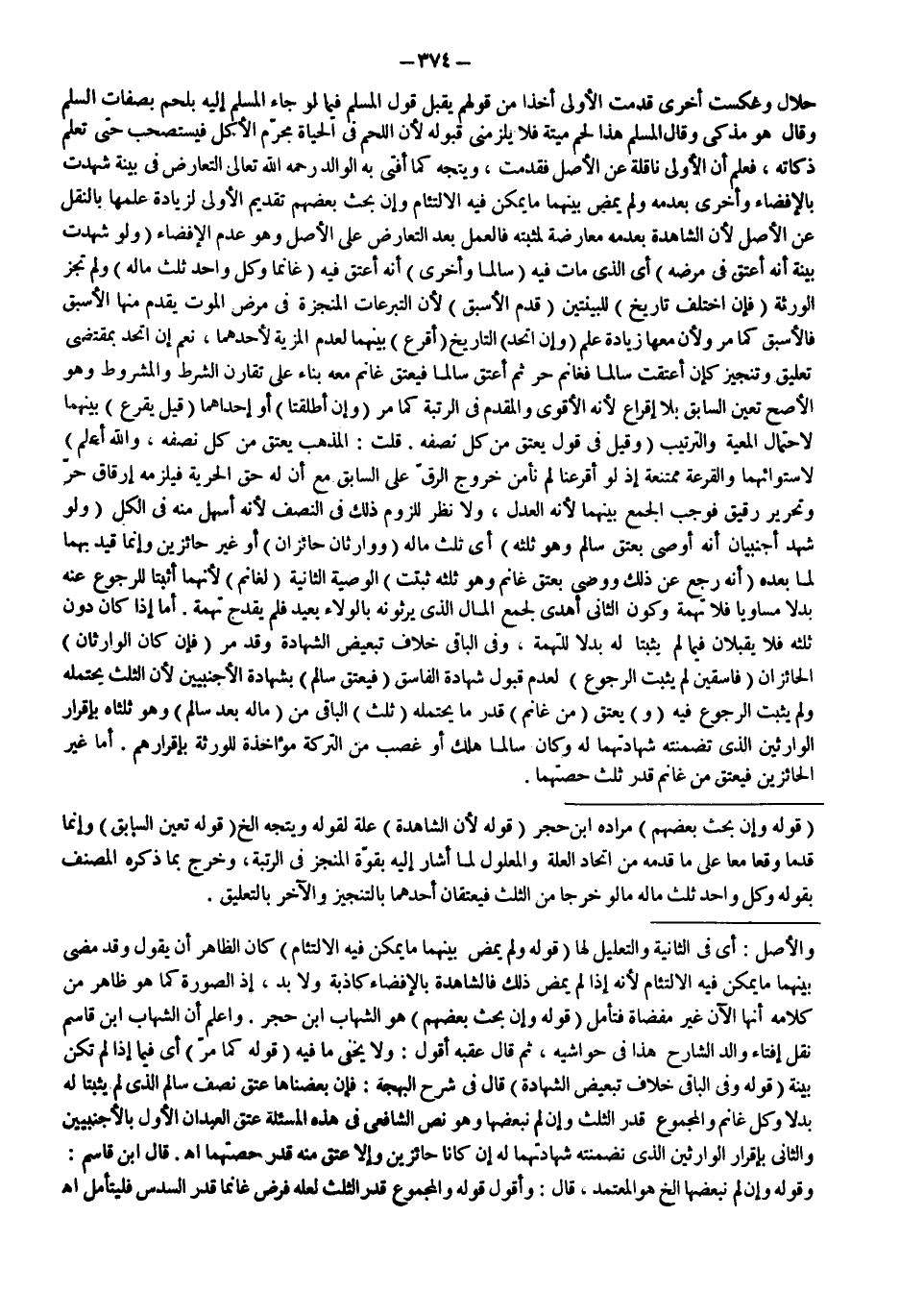 قَالَ ابْنُ قَاسِمٍ: وَقَوْلُهُ وَإِنْ لَمْ نُبَعِّضْهَا إلَخْ هُوَ الْمُعْتَمَدُ، قَالَ: وَأَقُولُ قَوْلُهُ وَالْمَجْمُوعُ قَدْرُ الثُّلُثِ لَعَلَّهُ فَرَضَ غَانِمًا قَدْرَ السُّدُسِ فَلْيُتَأَمَّلْ اهـ.