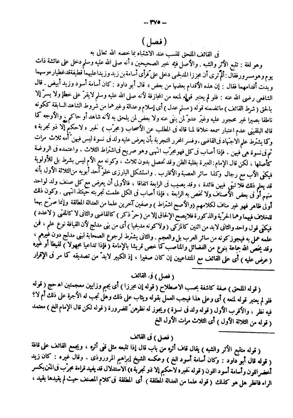 (فَصْلٌ) فِي الْقَائِفِ (قَوْلُهُ: مُتَتَبِّعُ الْأَثَرِ وَالشَّبَهِ) يُقَالُ قَافَ أَثَرَهُ مِنْ بَابِ قَالَ إذَا تَتَبَّعَهُ مِثْلُ قُفِيَ أَثَرُهُ، وَيُجْمَعُ الْقَائِفُ عَلَى قَافَةٍ (قَوْلُهُ: قَالَ أَبُو دَاوُد: وَكَانَ أُسَامَةُ أَسْوَدَ إلَخْ) وَعَكْسُهُ الشَّيْخُ إبْرَاهِيمُ الْمَرْوَرُوذِيُّ، وَقَالَ غَيْرُهُ: كَانَ زَيْدٌ أَخْضَرَ اللَّوْنِ وَأُسَامَةُ أَسْوَدَ اللَّوْنِ. .