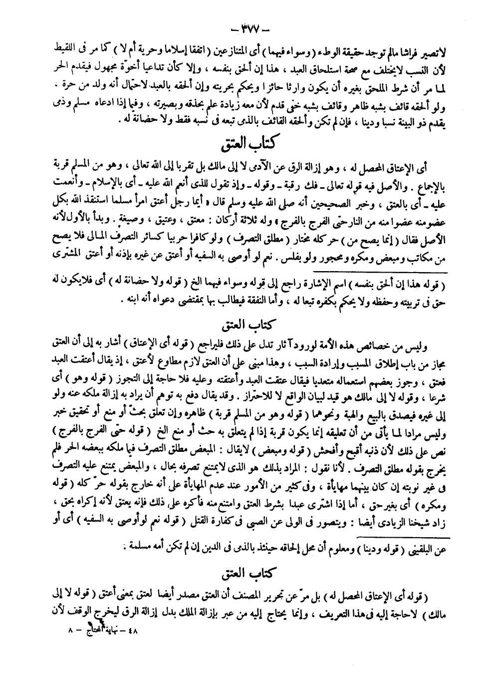 كِتَابُ الْعِتْقِ وَلَيْسَ مِنْ خَصَائِصِ هَذِهِ الْأُمَّةِ لِوُرُودِ آثَارٍ تَدُلُّ عَلَى ذَلِكَ فَلْيُرَاجَعْ (قَوْلُهُ: أَيْ الْإِعْتَاقُ) أَشَارَ بِهِ إلَى أَنَّ الْعِتْقَ مَجَازٌ مِنْ بَابِ إطْلَاقِ الْمُسَبِّبِ وَإِرَادَةِ السَّبَبِ، وَهَذَا مَبْنِيٌّ عَلَى أَنَّ الْعِتْقَ لَازِمٌ مُطَاوِعٌ لِأَعْتَقَ، إذْ يُقَالُ أَعْتَقْت الْعَبْدَ فَعَتَقَ، وَجَوَّزَ بَعْضُهُمْ اسْتِعْمَالَهُ مُتَعَدِّيًا فَيُقَالُ عَتَقْت الْعَبْدَ وَأَعْتَقْتُهُ وَعَلَيْهِ فَلَا حَاجَةَ إلَى التَّجَوُّزِ (قَوْلُهُ: وَهُوَ) أَيْ شَرْعًا، وَقَوْلُهُ: لَا إلَى مَالِكٍ هُوَ قَيْدٌ لِبَيَانِ الْوَاقِعِ لَا لِلِاحْتِرَازِ وَقَدْ يُقَالُ دُفِعَ بِهِ تَوَهُّمُ أَنْ يُرَادَ بِهِ إزَالَةُ مِلْكِهِ عَنْهُ وَلَوْ إلَى غَيْرِهِ فَيُصَدَّقُ بِالْبَيْعِ وَالْهِبَةِ وَنَحْوِهِمَا (قَوْلُهُ: وَهُوَ مِنْ الْمُسْلِمِ قُرْبَةٌ) ظَاهِرُهُ وَإِنْ تَعَلَّقَ بِحَثٍّ أَوْ مَنْعٍ أَوْ تَحْقِيقِ خَبَرٍ وَلَيْسَ مُرَادًا لِمَا يَأْتِي مِنْ أَنَّ تَعْلِيقَهُ إنَّمَا يَكُونُ قُرْبَةً إذَا لَمْ يَتَعَلَّقْ بِهِ حَثٌّ أَوْ مَنْعٌ إلَخْ (قَوْلُهُ: حَتَّى الْفَرْجَ بِالْفَرْجِ) نُصَّ عَلَى ذَلِكَ لِأَنَّ ذَنْبَهُ أَقْبَحُ وَأَفْحَشُ