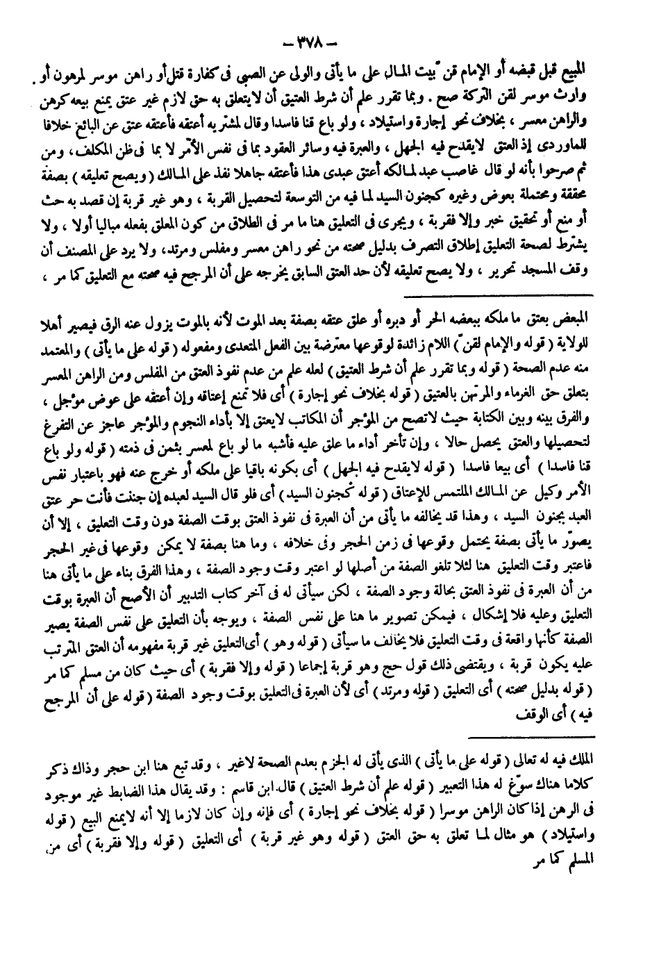 (قَوْلُهُ: كَجُنُونِ السَّيِّدِ) أَيْ فَلَوْ قَالَ السَّيِّدُ لِعَبْدِهِ: إنْ جُنِنْت فَأَنْتَ حُرٌّ عَتَقَ الْعَبْدُ بِجُنُونِ السَّيِّدِ، وَهَذَا قَدْ يُخَالِفُهُ مَا يَأْتِي مِنْ أَنَّ الْعِبْرَةَ فِي نُفُوذِ الْعِتْقِ بِوَقْتِ الصِّفَةِ دُونَ وَقْتِ التَّعْلِيقِ، إلَّا أَنْ يُصَوِّرَ مَا يَأْتِي بِصِفَةٍ يُحْتَمَلُ وُقُوعُهَا فِي زَمَنِ الْحَجْرِ وَفِي خِلَافِهِ، وَمَا هُنَا بِصِفَةٍ لَا يُمْكِنُ وُقُوعُهَا فِي غَيْرِ الْحَجْرِ فَاعْتُبِرَ وَقْتُ التَّعْلِيقِ هُنَا لِئَلَّا تَلْغُوَ الصِّفَةُ مِنْ أَصْلِهَا لَوْ اُعْتُبِرَ وَقْتُ وُجُودِ الصِّفَةِ، وَهَذَا الْفَرْقُ بِنَاءً عَلَى مَا يَأْتِي هُنَا مِنْ أَنَّ الْعِبْرَةَ فِي نُفُوذِ الْعِتْقِ بِحَالَةِ وُجُودِ الصِّفَةِ، لَكِنْ سَيَأْتِي لَهُ فِي آخِرِ كِتَابِ التَّدْبِيرِ أَنَّ الْأَصَحَّ أَنَّ الْعِبْرَةَ بِوَقْتِ التَّعْلِيقِ وَعَلَيْهِ فَلَا إشْكَالَ، فَيُمْكِنُ تَصْوِيرُ مَا هُنَا عَلَى نَفْسِ الصِّفَةِ، وَيُوَجَّهُ بِأَنَّ التَّعْلِيقَ عَلَى نَفْسِ الصِّفَةِ يُصَيِّرُ الصِّفَةَ كَأَنَّهَا وَاقِعَةٌ فِي وَقْتِ التَّعْلِيقِ فَلَا يُخَالِفُ مَا سَيَأْتِي (قَوْلُهُ: وَهُوَ) أَيْ التَّعْلِيقُ غَيْرُ قُرْبَةٍ مَفْهُومُهُ أَنَّ الْعِتْقَ الْمُتَرَتِّبَ عَلَيْهِ يَكُونُ قُرْبَةً، وَيَقْتَضِي ذَلِكَ قَوْلُ حَجّ وَهُوَ قُرْبَةٌ إجْمَاعًا (قَوْلُهُ: وَإِلَّا فَقُرْبَةٌ) أَيْ حَيْثُ كَانَ مِنْ مُسْلِمٍ كَمَا مَرَّ (قَوْلُهُ: بِدَلِيلِ صِحَّتِهِ) أَيْ التَّعْلِيقِ (قَوْلُهُ: وَمُرْتَدٍّ) أَيْ لِأَنَّ الْعِبْرَةَ فِي التَّعْلِيقِ بِوَقْتِ وُجُودِ الصِّفَةِ (قَوْلُهُ: عَلَى أَنَّ الْمُرَجَّحَ فِيهِ) أَيْ الْوَقْفِ.