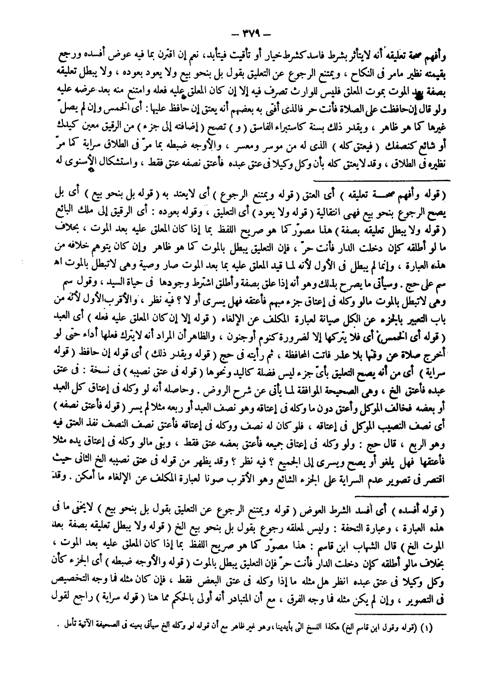 (قَوْلُهُ: وَيَمْتَنِعُ الرُّجُوعُ عَنْ التَّعْلِيقِ بِقَوْلٍ بَلْ بِنَحْوِ بَيْعٍ) لَا يَخْفَى مَا فِي هَذِهِ الْعِبَارَةِ، وَعِبَارَةُ التُّحْفَةِ: وَلَيْسَ لِمُعَلِّقِهِ رُجُوعٌ بِقَوْلٍ بَلْ بِنَحْوِ بَيْعٍ إلَخْ (قَوْلُهُ: وَلَا يَبْطُلُ تَعْلِيقُهُ بِصِفَةٍ بَعْدَ الْمَوْتِ إلَخْ) قَالَ الشِّهَابُ ابْنُ قَاسِمٍ: هَذَا مُصَوَّرٌ كَمَا هُوَ صَرِيحُ اللَّفْظِ بِمَا إذَا كَانَ الْمُعَلَّقُ عَلَيْهِ بَعْدَ الْمَوْتِ، بِخِلَافِ مَا لَوْ أَطْلَقَهُ كَإِنْ دَخَلْت الدَّارَ فَأَنْت حُرٌّ فَإِنَّ التَّعْلِيقَ يَبْطُلُ بِالْمَوْتِ