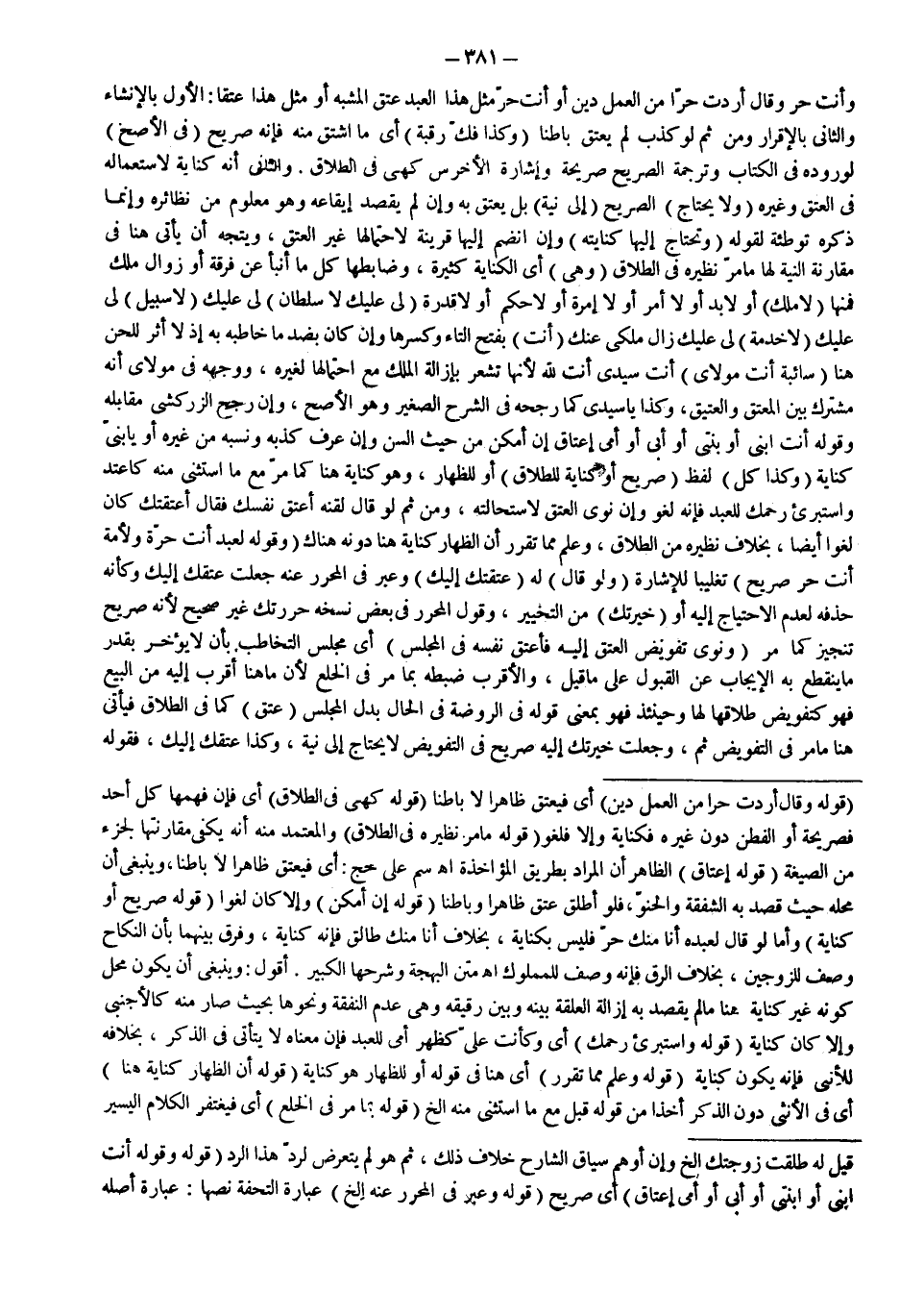 وَأَنْت حُرٌّ وَقَالَ: أَرَدْت حُرًّا مِنْ الْعَمَلِ دُيِّنَ أَوْ أَنْتَ حُرٌّ مِثْلُ هَذَا الْعَبْدِ عَتَقَ الْمُشَبَّهُ أَوْ مِثْلُ هَذَا عَتَقَا الْأَوَّلُ بِالْإِنْشَاءِ وَالثَّانِي بِالْإِقْرَارِ وَمِنْ ثَمَّ لَوْ كَذَبَ لَمْ يُعْتَقْ بَاطِنًا (وَكَذَا فَكُّ رَقَبَةٍ) أَيْ مَا اُشْتُقَّ مِنْهُ فَإِنَّهُ صَرِيحٌ (فِي الْأَصَحِّ) لِوُرُودِهِ فِي الْكِتَابِ وَتَرْجَمَةُ الصَّرِيحِ صَرِيحَةٌ وَإِشَارَةُ الْأَخْرَسِ كَهِيَ فِي الطَّلَاقِ وَالثَّانِي أَنَّهُ كِنَايَةٌ لِاسْتِعْمَالِهِ فِي الْعِتْقِ وَغَيْرِهِ.