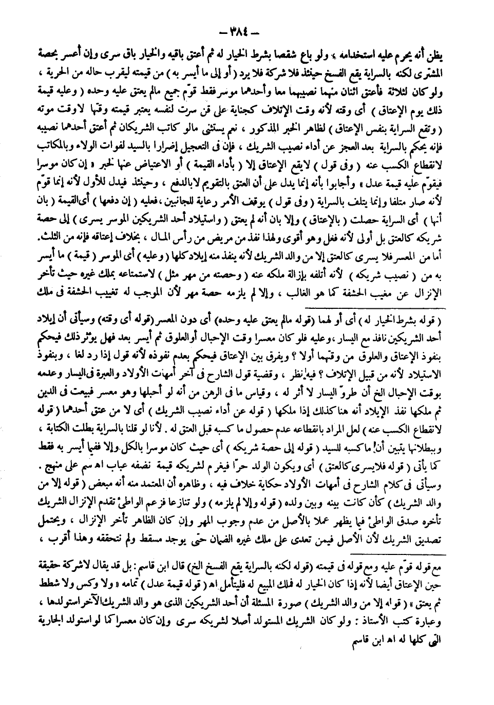 ـــــــــــــــــــــــــــــSقَوْلُهُ: بِشَرْطِ الْخِيَارِ لَهُ) أَيْ أَوْ لَهُمَا (قَوْلُهُ: مَا لَمْ يُعْتِقْ عَلَيْهِ وَحْدَهُ) أَيْ دُونَ الْمُعْسِرِ (قَوْلُهُ: أَيْ وَقْتَهُ) وَسَيَأْتِي أَنَّ إيلَادَ أَحَدِ الشَّرِيكَيْنِ نَافِذٌ مَعَ الْيَسَارِ، وَعَلَيْهِ فَلَوْ كَانَ مُعْسِرًا وَقْتَ الْإِحْبَالِ أَوْ الْعُلُوقِ ثُمَّ أَيْسَرَ بَعْدُ فَهَلْ يُؤَثِّرُ ذَلِكَ فَيُحْكَمُ بِنُفُوذِ الْإِعْتَاقِ وَالْعُلُوقِ مِنْ وَقْتِهِمَا أَوْ لَا وَيُفَرَّقُ بَيْنَ الْإِعْتَاقِ فَيُحْكَمُ بِعَدَمِ نُفُوذِهِ لِأَنَّهُ قَوْلٌ إذَا رُدَّ لَغَا، وَبِنُفُوذِ الِاسْتِيلَادِ لِأَنَّهُ مِنْ قُبَيْلِ الْإِتْلَافِ؟ فِيهِ نَظَرٌ، وَقَضِيَّةُ قَوْلِ الشَّارِحِ فِي آخِرِ أُمَّهَاتِ الْأَوْلَادِ وَالْعِبْرَةُ فِي الْيَسَارِ وَعَدَمِهِ بِوَقْتِ الْإِحْبَالِ إلَخْ أَنَّ طُرُوُّ الْيَسَارِ لَا أَثَرَ لَهُ، وَقِيَاسُ مَا فِي الرَّهْنِ مِنْ أَنَّهُ لَوْ أَحْبَلَهَا وَهُوَ مُعْسِرٌ فَبِيعَتْ فِي الدَّيْنِ ثُمَّ مَلَكَهَا نَفَذَ الْإِيلَادُ أَنَّهُ هُنَا كَذَلِكَ إذَا مَلَكَهَا (قَوْلُهُ: عَنْ أَدَاءِ نَصِيبِ الشَّرِيكِ) أَيْ لَا مِنْ عِتْقِ أَحَدِهِمَا (قَوْلُهُ: لِانْقِطَاعِ الْكَسْبِ عَنْهُ) لَعَلَّ الْمُرَادَ بِانْقِطَاعِهِ عَدَمُ حُصُولِ مَا كَسَبَهُ قَبْلَ الْعِتْقِ لَهُ لِأَنَّا لَوْ قُلْنَا بِالسِّرَايَةِ بَطَلَتْ الْكِتَابَةُ، وَبِبُطْلَانِهَا يَتَبَيَّنُ أَنَّ مَا كَسَبَهُ لِلسَّيِّدِ.