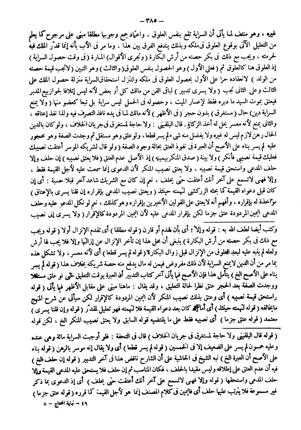 غَيْرِهِ، وَهُوَ مُنْتَفٍ لِمَا يَأْتِي أَنَّ السِّرَايَةَ تَقَعُ بِنَفْسِ الْعُلُوقِ، وَاعْتِمَادُ جَمْعٍ وُجُوبَهَا مُطْلَقًا مَبْنِيٌّ عَلَى مَرْجُوحٍ كَمَا يُعْلَمُ مِنْ التَّعْلِيلِ الْآتِي بِوُقُوعِ الْعُلُوقِ فِي مِلْكِهِ وَبِذَلِكَ يَنْدَفِعُ الْفَرْقُ بَيْنَ هَذَا، وَمَا مَرَّ فِي الْأَبِ بِأَنَّهُ إنَّمَا قَدَّرَ الْمِلْكَ فِيهِ لِحُرْمَتِهِ، وَيَجِبُ مَعَ ذَلِكَ فِي بِكْرٍ حِصَّتُهُ مِنْ أَرْشِ الْبَكَارَةِ.