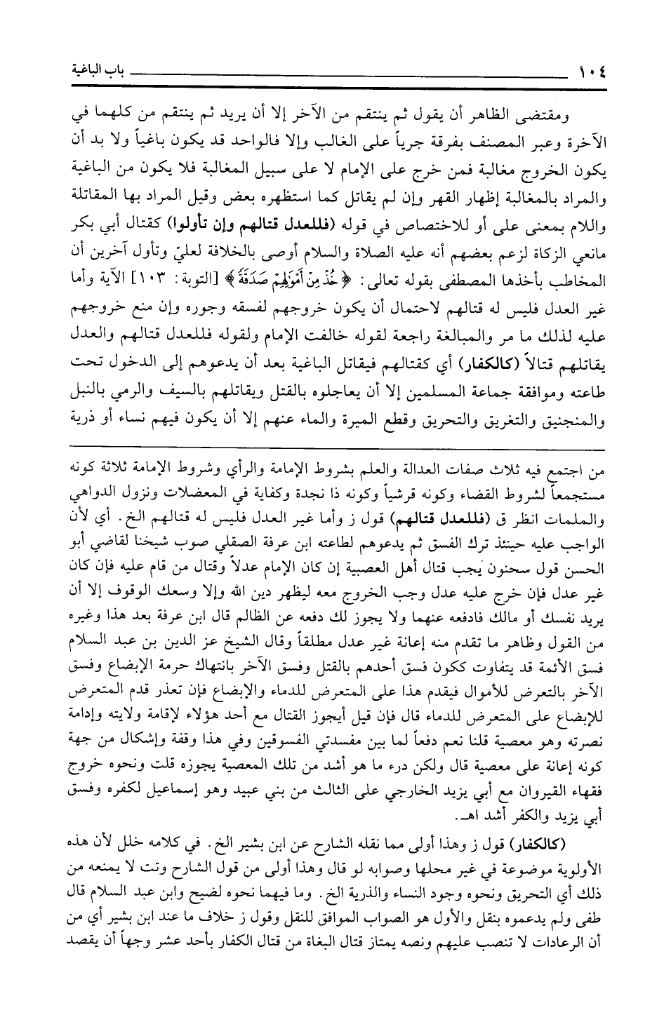 ومقتضى الظاهر أن يقول ثم ينتقم من الآخر إلا أن يريد ثم ينتقم من كلهما في الآخرة وعبر المصنف بفرقة جريًا على الغالب وإلا فالواحد قد يكون باغيًا ولا بد أن يكون الخروج مغالبة فمن خرج على الإِمام لا على سبيل المغالبة فلا يكون من الباغية والمراد بالمغالبة إظهار القهر وإن لم يقاتل كما استظهره بعض وقيل المراد بها المقاتلة واللام بمعنى على أو للاختصاص في قوله (فللعدل قتالهم وإن تأولوا) كقتال أبي بكر مانعي الزكاة لزعم بعضهم أنه عليه الصلاة والسلام أوصى بالخلافة لعلي وتأول آخرين أن المخاطب بأخذها المصطفى بقوله تعالى: {خُذْ مِنْ أَمْوَالِهِمْ صَدَقَةً} [التوبة: 103] الآية وأما غير العدل فليس له قتالهم لاحتمال أن يكون خروجهم لفسقه وجوره وإن منع خروجهم عليه لذلك ما مر والمبالغة راجعة لقوله خالفت الإِمام ولقوله فللعدل قتالهم والعدل يقاتلهم قتالًا (كالكفار) أي كقتالهم فيقاتل الباغية بعد أن يدعوهم إلى الدخول تحت طاعته وموافقة جماعة المسلمين إلا أن يعاجلوه بالقتل ويقاتلهم بالسيف والرمي بالنبل والمنجنيق والتغريق والتحريق وقطع الميرة والماء عنهم إلا أن يكون فيهم نساء أو ذرية