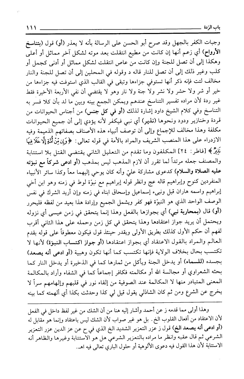 وجبات الكفر بالجهل وقد صرح أبو الحسن على الرسالة بأنه لا يعذر (أو) قول (بتناسخ الأرواح) أي زعم أنها إن كانت من مطيع انتقلت بعد موته لشكل آخر مماثل أو أعلى وهكذا إلى أن تصل للجنة وإن كانت من عاص انتقلت لشكل مماثل أو أدنى كجمل أو كلب وغير ذلك إلى أن تصل للنار قاله د وقوله في المحلين إلى أن تصل للجنة والنار مخالف لتت فإنه ذكر أنها تستوفي جزاءها وتبقى في القالب الذي استوفت فيه جزاءها من خير أو شر ولا حشر ولا نشر ولا جنة ولا نار وهو لا يقتضي أن نفي الأربعة الأخيرة فقط غير ردة لأن مراده تفسير التناسخ عندهم ويمكن الجمع بينه وبين ما لد بأن كلا فسر به التناسخ وفي كلام الشيخ داود إشارة لذلك (أو في كل جنس) من أجناس الحيوانات من قردة وخنازير ودود ونحوها (نذير) أي نبي فيكفر لأنه يؤدي إلى أن جميع الحيوانات مكلفة وهذا مخالف للإجماع وإلى أن توصف أنبياء هذه الأصناف بصفاتهم الذميمة وفيه الازدراء على هذا المنصب الشريف والمراد بالأمة في قوله تعالى: {وَإِنْ مِنْ أُمَّةٍ إِلَّا خَلَا فِيهَا نَذِيرٌ} [فاطر: 24] المكلفون وما تقدم من التعليل الثاني يقتضي القتل بلا استتابة والمصنف جعله مرتدًا لما تقرر أن لازم المذهب ليس بمذهب (أو ادعى شركًا مع نبوّته عليه الصلاة والسلام) كدعوى مشاركة عليّ وأنه كان يوحي إليهما معًا وكذا سائر الأنبياء المنفردين كنوح وإبراهيم قاله عج وانظر قوله إبراهيم مع نبوّة لوط في زمنه وهو ابن أخي إبراهيم واسمه هاران قبل ونبىء إسماعيل وإسحاق ابناه في زمنه وإن أريد الشرك في نفس الوصف الواحد الذي هو النبوّة فهو كفر ويشمل الجميع وإرادة هذا بعيد من لفظه فليحرر (أو) قال (بمحاربة نبي) أي بجوازها بالفعل وهذا إنما يتحقق في زمن عيسى أي نزوله ويحتمل أن يريد جواز اعتقادها وهذا يتحقق في كل زمن وحمله على هذا الثاني أقرب لفهم أن حكم الأول كذلك بطريق الأولى ويقدر حينئذ قول فيكون معطوفًا على قوله بقدم العالم والمراد بالقول الاعتقاد أي بجواز اعتقادها (أو جواز اكتساب النبوّة) لأنها لا تكتسب بحال بخلاف الولاية فإنها تكتسب كما أنها تكون وهبية (أو ادعى أنه يصعد) بجسده (للسماء) أو يدخل الجنة ويأكل من ثمارها كما في الذخيرة أو يدخل النار كما بحثه الشعراوي أو مجالسة الله أو مكالمته فكافر إجماعًا كما في الشفاء وأراد بالمكالمة المعنى المتبادر منها لا المكالمة عند الصوفية من إلقاء نور في قلبهم وإلهامهم سرًّا لا يخرج عن الشرع ومن ثم كان الشاذلي يقول قيل لي كذا وحدثت بكذا أي ألهمته كما بينه