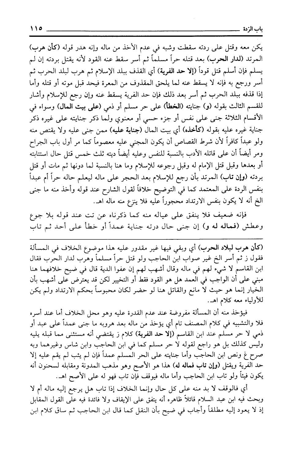 يكن معه وقتل على ردته سقطت وشبه في عدم الأخذ من ماله وإنه هدر قوله (كأن هرب) المرتد (لدار الحرب) بعد قتله حرًّا مسلمًا ثم أسر سقط عنه القود لأنه يقتل بردته إن لم يسلم فإن أسلم قتل قودًا (إلا حد الفرية) أي القذف ببلد الإِسلام ثم هرب لبلد الحرب ثم أسر ورجع به فإنه لا يسقط عنه لما يلحق المقذوف من المعرة فيحد قبل موته أو قتله وأما إذا قذفه ببلد الحرب ثم أسر بعد ذلك فإن حد الفرية يسقط عنه وإن رجع للإسلام وأشار للقسم الثالث بقوله (و) جنايته (الخطأ) على حر مسلم أو ذمي (على بيت المال) وسواء في الأقسام الثلاثة جنى على نفس أو جزء حسي أو معنوي ولما ذكر جنايته على غيره ذكر جناية غيره عليه بقوله (كأخذه) أي بيت المال (جناية عليه) ممن جنى عليه ولا يقتص منه ولو عبدًا كافرًا لأن شرط القصاص أن يكون المجني عليه معصومًا كما مر أول باب الجراح ومر أيضًا أن على قاتله الأدب بالنسبة للنفس وعليه أيضًا ديته ثلث خمس قتل حال استتابته أو بعدها وقبل قتل الإِمام له وقبل رجوعه للإسلام وما هنا بالنسبة لما دونها ثم مات أو قتل بردته (وإن تاب) المرتد بأن رجع للإسلام بعد الحجر على ماله ليعلم حاله حرًّا أم عبدًا بنفس الردة على المعتمد كما في التوضيح خلافًا لقول الشارح عند قوله وأخذ منه ما جنى الخ أنه لا يكون بنفس الارتداد محجورًا عليه فلا ينزع منه ماله اهـ. فإنه ضعيف فلا ينفق على عياله منه كما ذكرناه عن تت عند قوله بلا جوع وعطش (فماله له و) إن جنى حال درته جناية عمدًا أو خطأ على أحد ثم تاب