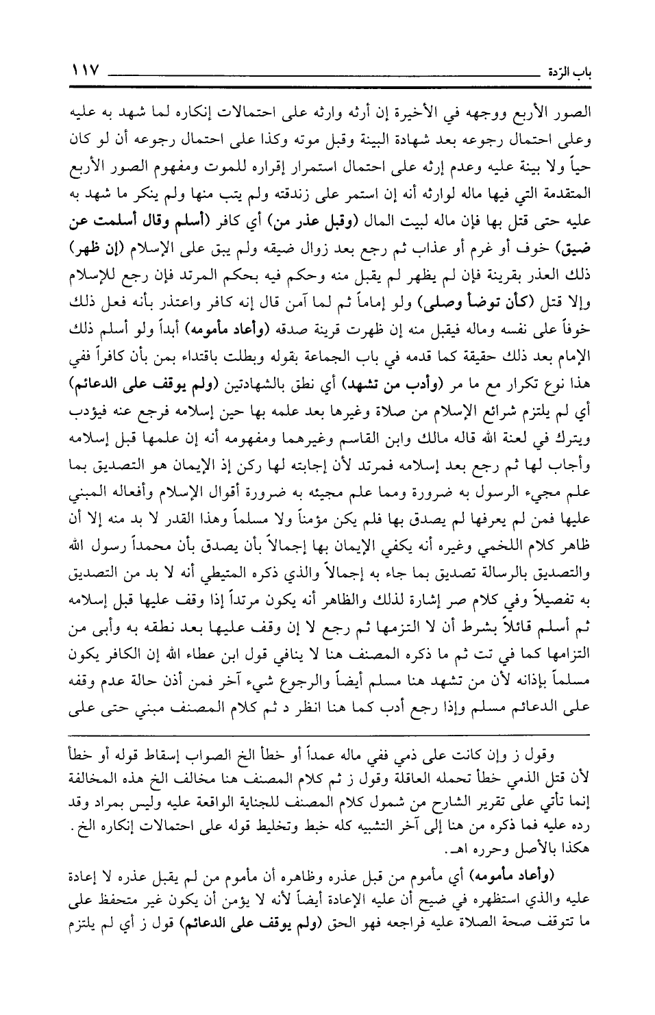 الصور الأربع ووجهه في الأخيرة إن أرثه وارثه على احتمالات إنكاره لما شهد به عليه وعلى احتمال رجوعه بعد شهادة البينة وقبل موته وكذا على احتمال رجوعه أن لو كان حيًّا ولا بينة عليه وعدم إرثه على احتمال استمرار إقراره للموت ومفهوم الصور الأربع المتقدمة التي فيها ماله لوارثه أنه إن استمر على زندقته ولم يتب منها ولم ينكر ما شهد به عليه حتى قتل بها فإن ماله لبيت المال (وقبل عذر من) أي كافر (أسلم وقال أسلمت عن ضيق) خوف أو غرم أو عذاب ثم رجع بعد زوال ضيقه ولم يبق على الإِسلام (إن ظهر) ذلك العذر بقرينة فإن لم يظهر لم يقبل منه وحكم فيه بحكم المرتد فإن رجع للإسلام وإلا قتل (كأن توضأ وصلى) ولو إمامًا ثم لما آمن قال إنه كافر واعتذر بأنه فعل ذلك خوفًا على نفسه وماله فيقبل منه إن ظهرت قرينة صدقه (وأعاد مأمومه) أبدًا ولو أسلم ذلك الإِمام بعد ذلك حقيقة كما قدمه في باب الجماعة بقوله وبطلت باقتداء بمن بأن كافرًا ففي هذا نوع تكرار مع ما مر (وأدب من تشهد) أي نطق بالشهادتين (ولم يوقف على الدعائم) أي لم يلتزم شرائع الإِسلام من صلاة وغيرها بعد علمه بها حين إسلامه فرجع عنه فيؤدب ويترك في لعنة الله قاله مالك وابن القاسم وغيرهما ومفهومه أنه إن علمها قبل إسلامه وأجاب لها ثم رجع بعد إسلامه فمرتد لأن إجابته لها ركن إذ الإيمان هو التصديق بما علم مجيء الرسول به ضرورة ومما علم مجيئه به ضرورة أقوال الإِسلام وأفعاله المبني عليها فمن لم يعرفها لم يصدق بها فلم يكن مؤمنًا ولا مسلمًا وهذا القدر لا بد منه إلا أن ظاهر كلام اللخمي وغيره أنه يكفي الإيمان بها إجمالًا بأن يصدق بأن محمدًا رسول الله والتصديق بالرسالة تصديق بما جاء به إجمالًا والذي ذكره المتيطي أنه لا بد من التصديق به تفصيلًا وفي كلام صر إشارة لذلك والظاهر أنه يكون مرتدًا إذا وقف عليها قبل إسلامه ثم أسلم قائلًا بشرط أن لا التزمها ثم رجع لا إن وقف عليها بعد نطقه به وأبى من التزامها كما في تت ثم ما ذكره المصنف هنا لا ينافي قول ابن عطاء الله إن الكافر يكون مسلمًا بإذانه لأن من تشهد هنا مسلم أيضًا والرجوع شيء آخر فمن أذن حالة عدم وقفه على الدعائم مسلم وإذا رجع أدب كما هنا انظر د ثم كلام المصنف مبني حتى على