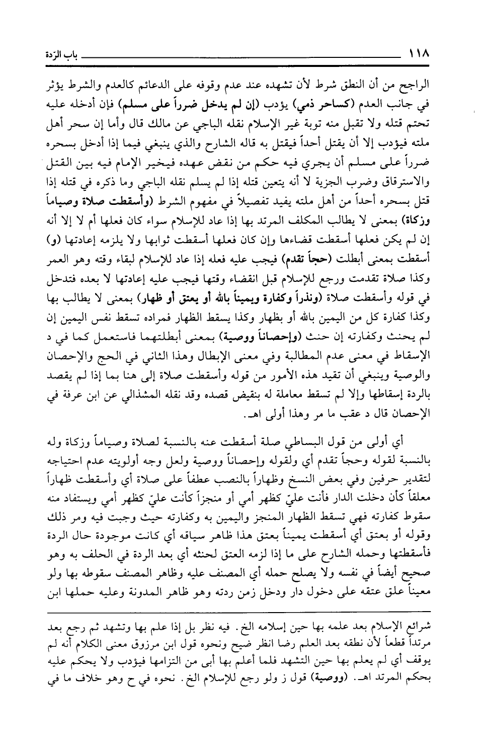 الراجح من أن النطق شرط لأن تشهده عند عدم وقوفه على الدعائم كالعدم والشرط يؤثر في جانب العلم (كساحر ذمي) يؤدب (إن لم يدخل ضررًا على مسلم) فإن أدخله عليه تحتم قتله ولا تقبل منه توبة غير الإِسلام نقله الباجي عن مالك قال وأما إن سحر أهل ملته فيؤدب إلا أن يقتل أحدًا فيقتل به قاله الشارح والذي ينبغي فيما إذا أدخل بسحره ضررًا على مسلم أن يجري فيه حكم من نقض عهده فيخير الإِمام فيه بين القتل والاسترقاق وضرب الجزية لا أنه يتعين قتله إذا لم يسلم نقله الباجي وما ذكره في قتله إذا قتل بسحره أحدًا من أهل ملته يفيد تفصيلًا في مفهوم الشرط (وأسقطت صلاة وصيامًا وزكاة) بمعنى لا يطالب المكلف المرتد بها إذا عاد للإسلام سواء كان فعلها أم لا إلا أنه إن لم يكن فعلها أسقطت قضاءها وإن كان فعلها أسقطت ثوابها ولا يلزمه إعادتها (و) أسقطت بمعنى أبطلت (حجًّا تقدم) فيجب عليه فعله إذا عاد للإسلام لبقاء وقته وهو العمر وكذا صلاة تقدمت ورجع للإسلام قبل انقضاء وقتها فيجب عليه إعادتها لا بعده فتدخل في قوله وأسقطت صلاة (ونذرًا وكفارة ويمينًا بالله أو يعتق أو ظهار) بمعنى لا يطالب بها وكذا كفارة كل من اليمين بالله أو بظهار وكذا يسقط الظهار فمراده تسقط نفس اليمين إن لم يحنث وكفارته إن حنث (وإحصانًا ووصية) بمعنى أبطلتهما فاستعمل كما في د الإسقاط في معنى عدم المطالبة وفي معنى الإبطال وهذا الثاني في الحج والإحصان والوصية وينبغي أن تقيد هذه الأمور من قوله وأسقطت صلاة إلى هنا بما إذا لم يقصد بالردة إسقاطها وإلا لم تسقط معاملة له بنقيض قصده وقد نقله المشذالي عن ابن عرفة في الإحصان قال د عقب ما مر وهذا أولى اهـ.