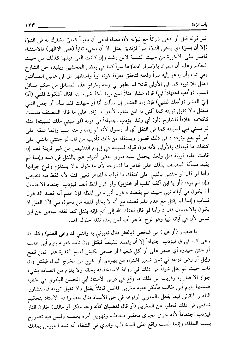 غير قوله قبل أو ادعى شركًا مع نبوّته لأن معناه ادعى أن معينًا كعليّ مشارك له في النبوّة (إلا أن يسرّ) أي يدعي النبوّة سرًّا فزنديق يقتل إلا أن يجيء تائبًا (على الأظهر) فالاستثناء قاصر على الأخيرة من حيث النسبة لابن رشد وإن كانت التي قبلها كذلك من حيث الحكم وعلم أن المراد بالإسرار ادعاؤها سرًّا كما في بعض المحشين ويفيده حل الشارح وفي تت بأن يدعو إليه سرًّا ولعله لتحقق معرفة كونه نبيًّا واستظهر مق في هاتين المسألتين القتل بلا توبة كما في الأولى قائلًا لم يظهر لي وجه إخراج هذه المسائل من حكم مسائل السب (وأدب اجتهادًا في) قول عشار مثلًا لمن يريد أخذ شيء منه فقال أشكوك للنبي (أدّ) إليّ العشر (وأشك للنبي) فإن زاد العشار إن سألت أنا أو جهلت فقد سأل أو جهل النبي فيقتل ولا تقبل توبته كما أفتى به ابن عتاب لأجل ما زاده على ما قاله المصنف فليست ككلامه خلافًا للشارح (أو) أي وكذا يؤدب اجتهادًا في قوله (لو سبني ملك لسببته) مثله لو سبني نبي لسببته كما في النقل أي أو رسول لأنه لم يصدر منه سب وإنما علفه على أمر لم يقع وتردد د في ذلك قصور ويستفاد من ذلك تأديب من قال لو جئتني بالنبي على كنفك ما قبلتك بالأولى لأنه دون قوله لسببته في إيهام التنقيص من غير قرينة نعم إن قامت عليه قرينة قتل ولعله يحمل عليه فتوى بعض أشياخ عج بالقتل في هذه وإنما لم يقيد مسألة المصنف بذلك على ظاهر ما لشارحه لأن مدخول لولا يستلزم وقوع جوابها وأما لو قال لو جئتني بالنبي على كنفك ما قبلته فالظاهر تعين قتله لأنه لفظ فيه تنقيص وإن لم يرده (أو يا ابن ألف كلب أو خنزير) ولو كرر لفظ ألف فيؤدب اجتهاد الاحتمال أن يكون في آبائه نبي حيث لم يقصد دخول أنبياء في لفظه فإن علم أنه قصد الدخول فساب وإنما لم يقتل مع عدم علم قصده مع أنه لا يخلو لفظه من دخول نبي لأن القتل لا يكون بالاحتمال قال د وأما لو قال لعنك الله إلى آدم فإنه يقتل كما نقله عياض عن ابن شاس لأن في آبائه نبيًّا وهو نوح إذ هو أب لمن بعده نقله حلولو اهـ.